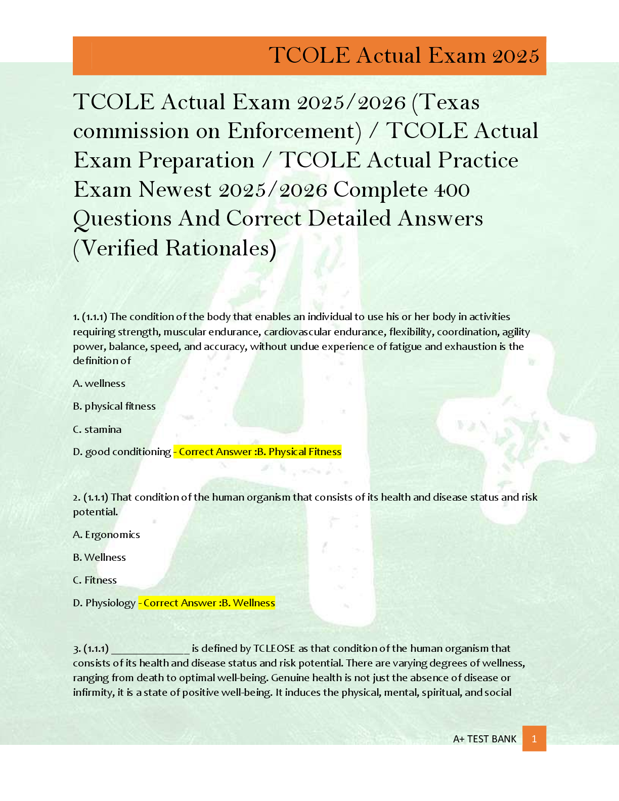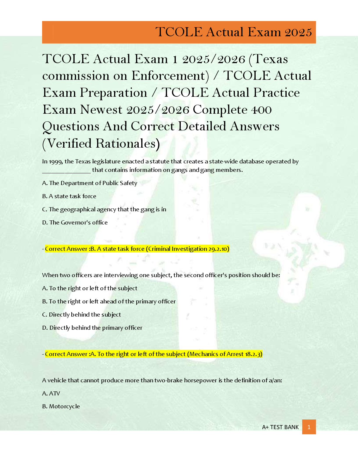 *NURSING > EXAM > TCOLE Actual Exam 1 2025/2026 (Texas commission on Enforcement) / TCOLE Actual Exam Preparation / TCOLE Actual Practice Exam Newest 2025/2026 Complete 400 Questions And Correct Detailed Answers (Verified Rationales)