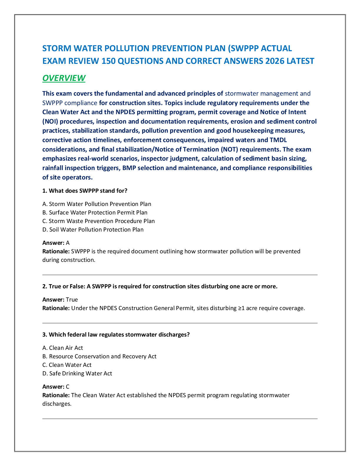 QAC Laws and Regulations > EXAM REVIEW > STORM WATER POLLUTION PREVENTION PLAN (SWPPP ACTUAL EXAM REVIEW 150 QUESTIONS AND CORRECT ANSWERS 2026 LATEST