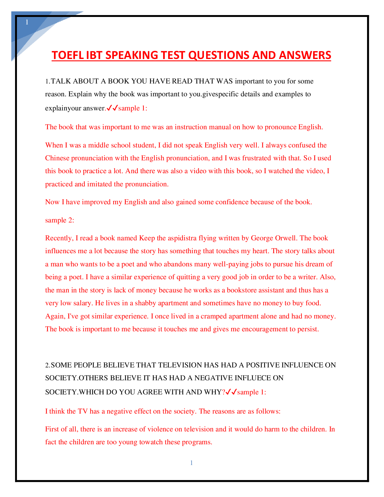 Health Care > EXAM > TOEFL IBT SPEAKING TEST QUESTIONS AND ANSWERS