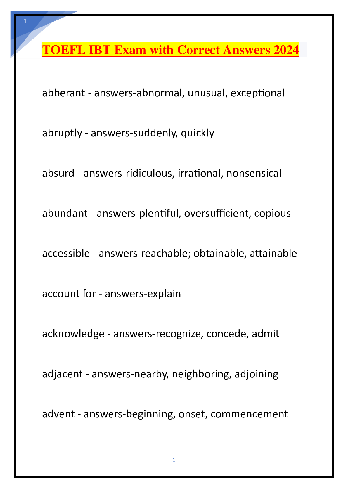 *NURSING > EXAM > TOEFL Ibt Practice Test: 60 Questions With Answers & Rationales