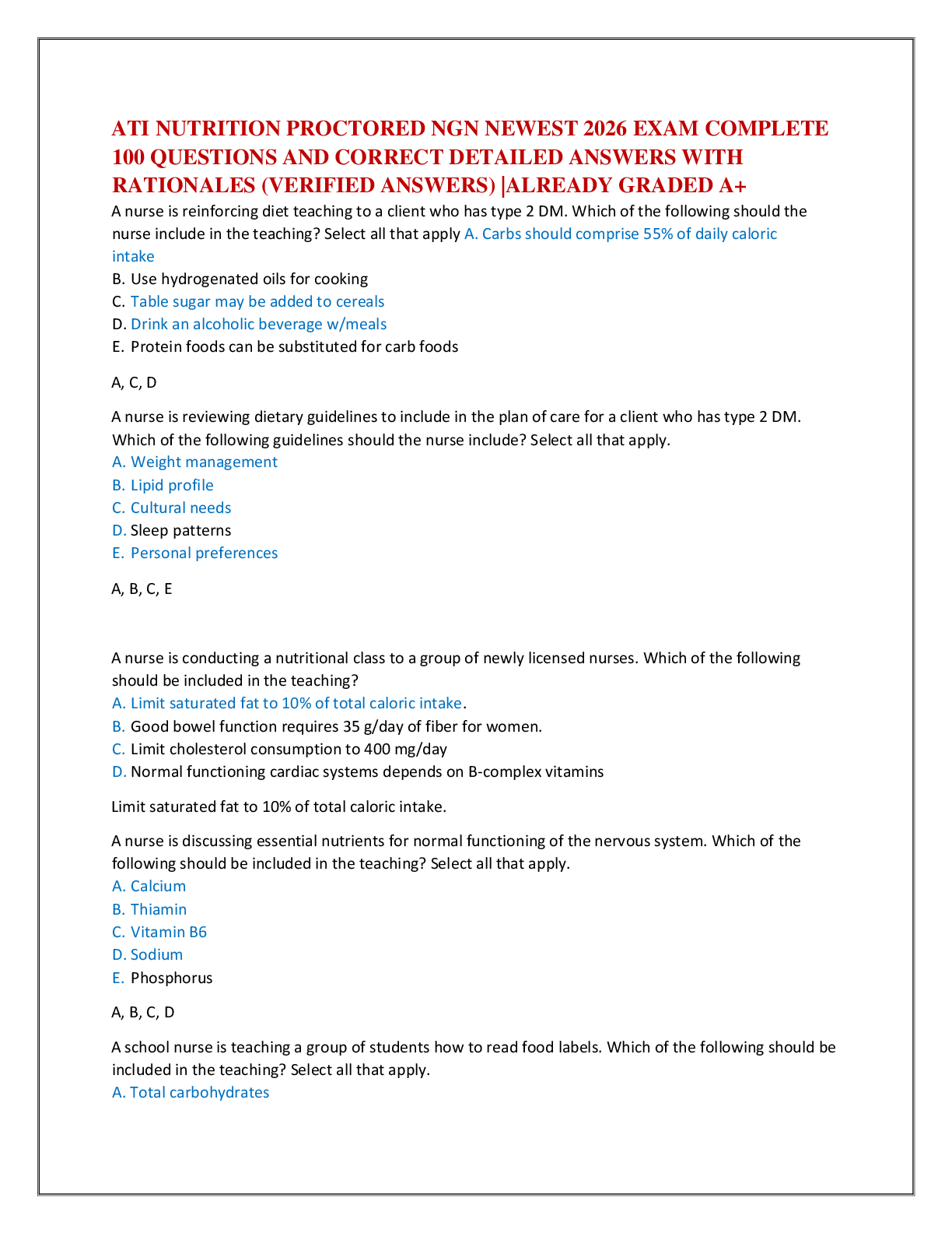 *NURSING > EXAM > ATI NUTRITION PROCTORED NGN NEWEST 2026 EXAM COMPLETE 100 QUESTIONS AND CORRECT DETAILED ANSWERS WITH RATIONALES (VERIFIED ANSWERS) |ALREADY GRADED A+
