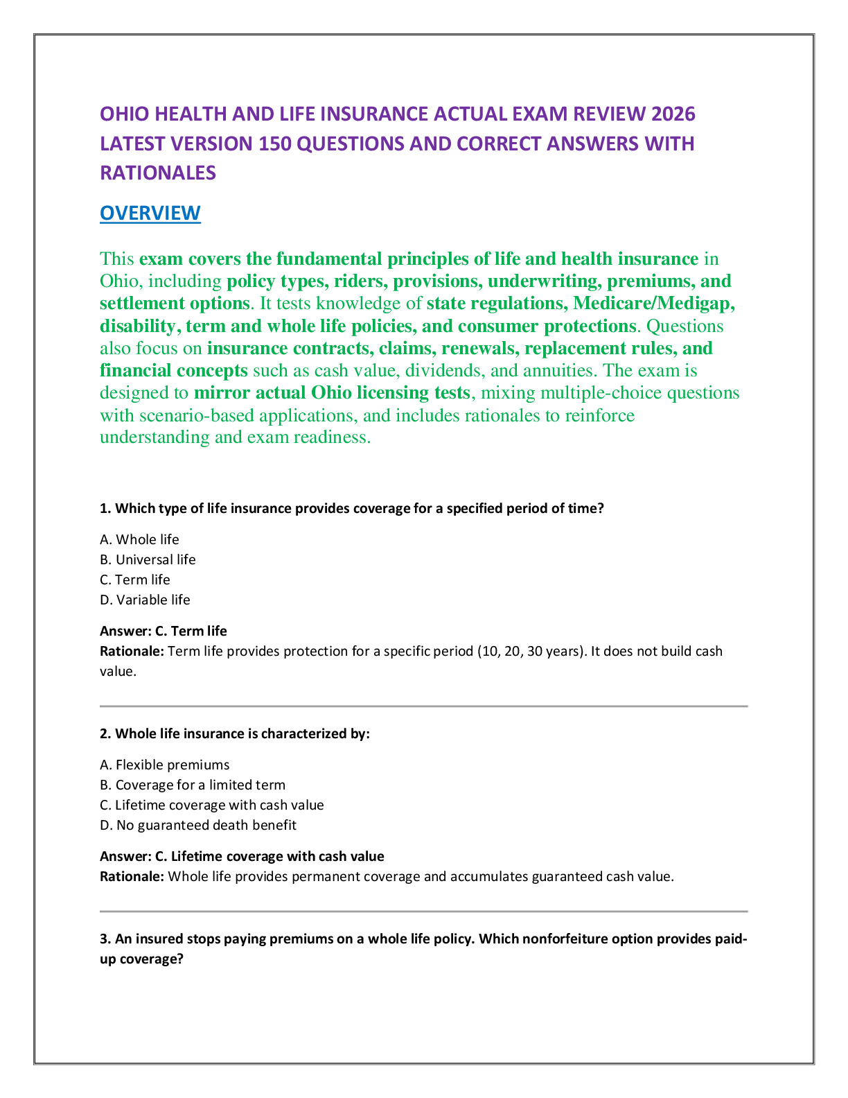*NURSING > EXAM REVIEW > OHIO HEALTH AND LIFE INSURANCE ACTUAL EXAM REVIEW 2026 LATEST VERSION 150 QUESTIONS AND CORRECT ANSWERS WITH RATIONALES
