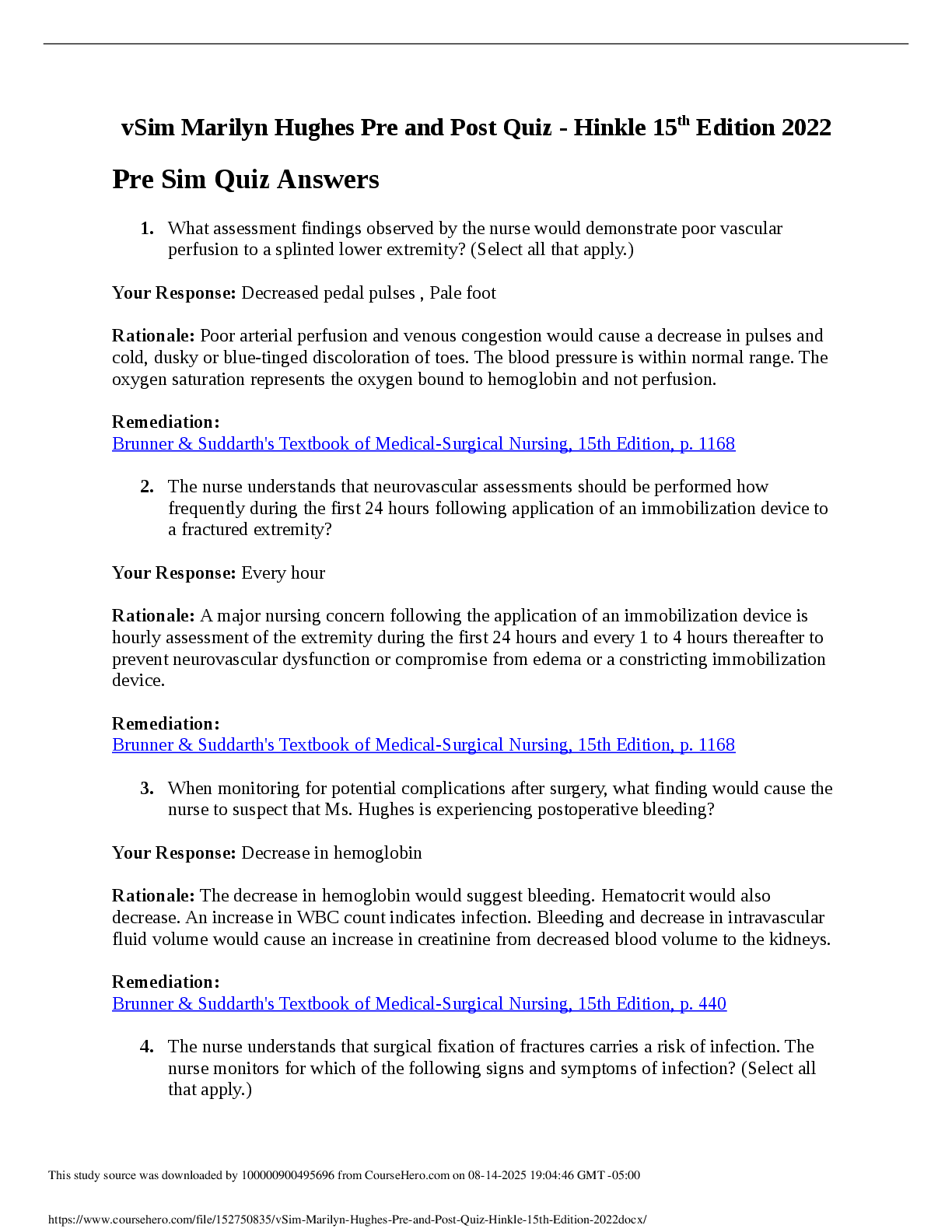 *NURSING > EXAM > vSim Marilyn Hughes Pre and Post Quiz - Hinkle 15th Edition 2022 Pre Sim Quiz Answers