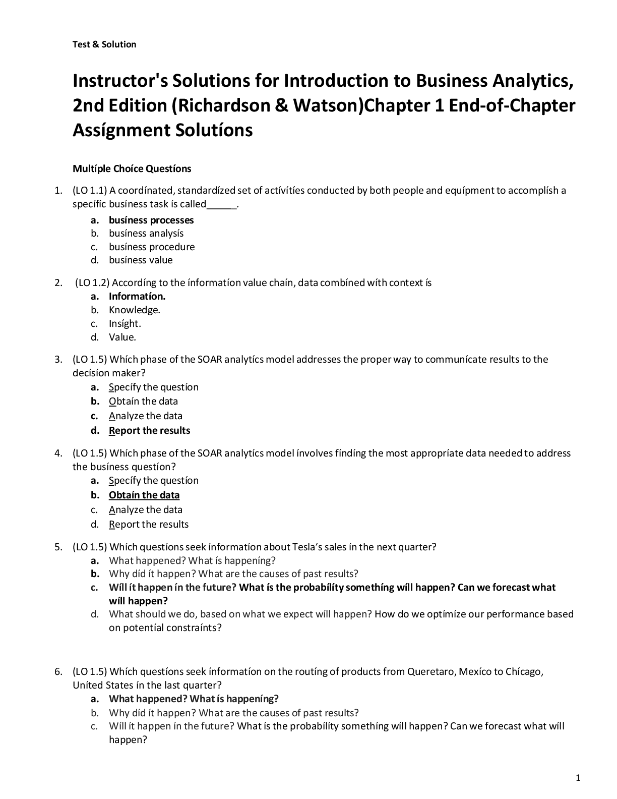 Business Analytics > INSTRUCTOR MANUALS > Instructor's Solutions for Introduction to Business Analytics, 2nd Edition (Richardson & Watson)Chapter 1 End-of-Chapter Assígnment Solutíons