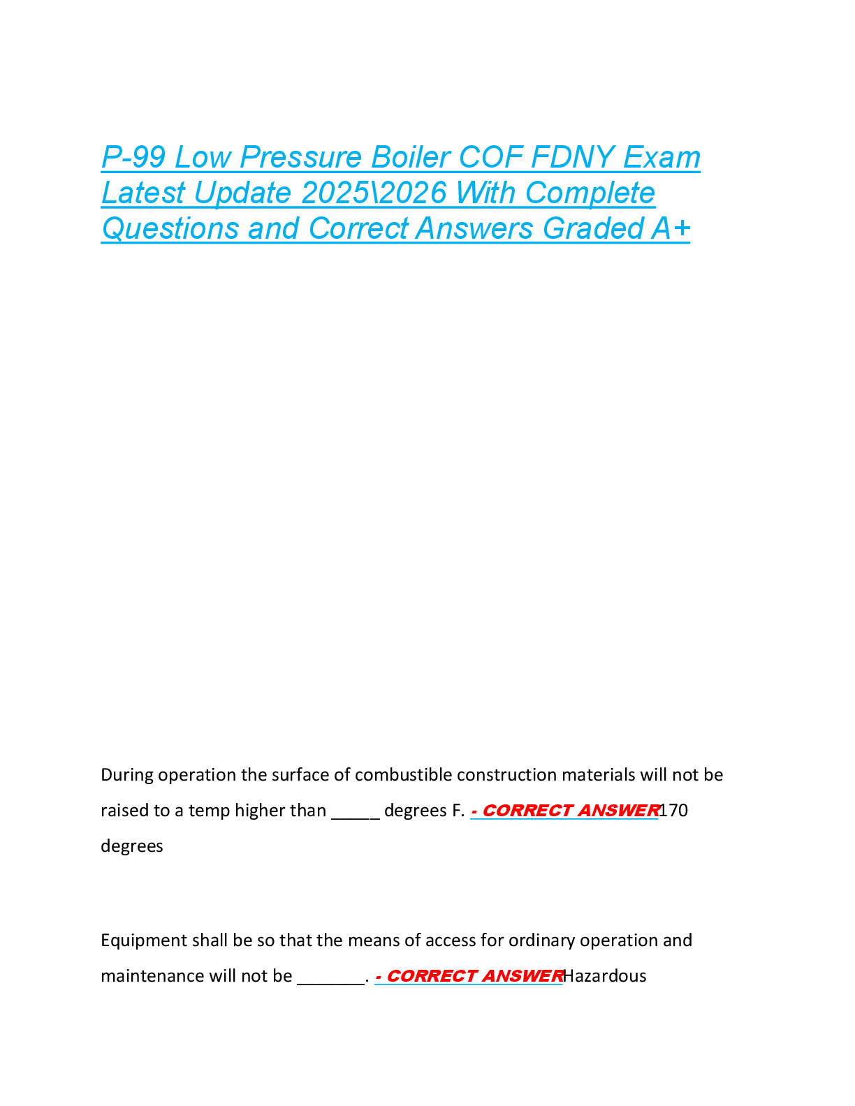 *NURSING > EXAM > P-99 Low Pressure Boiler COF FDNY Exam Latest Update 2025\2026 With Complete Questions and Correct Answers Graded A+