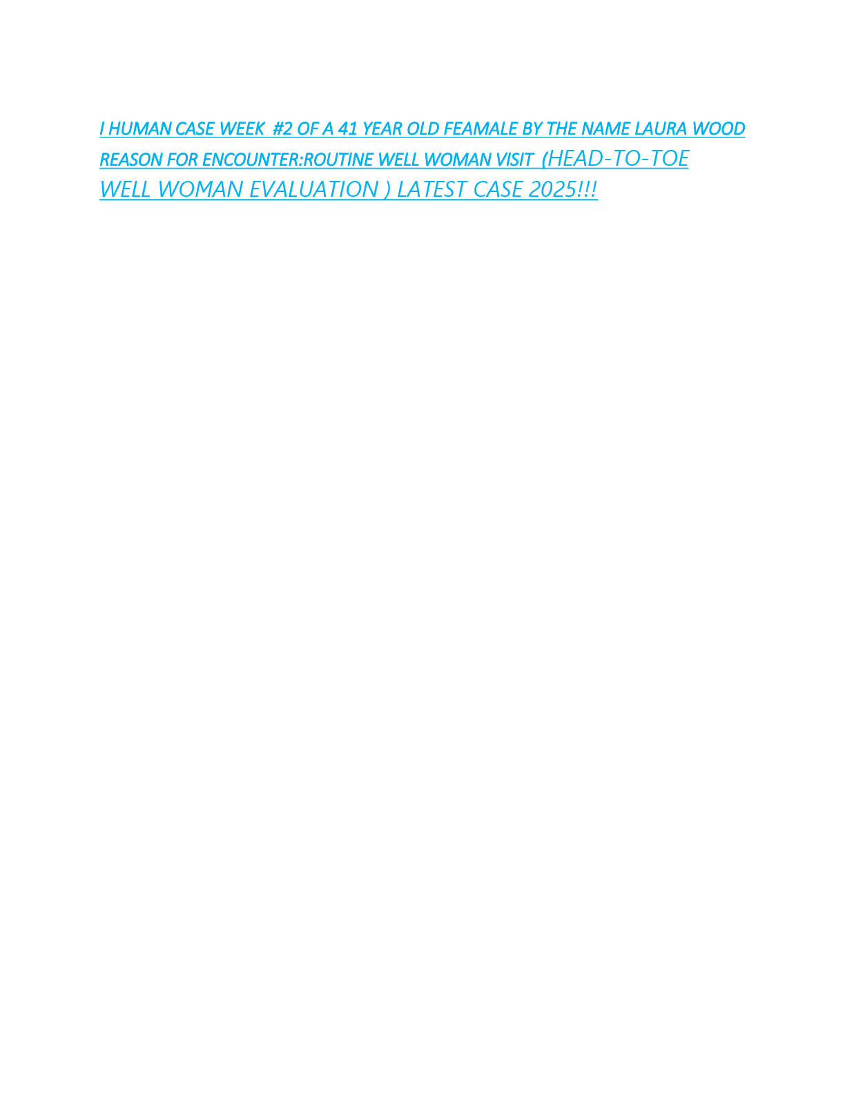 *NURSING > EXAM > I HUMAN CASE WEEK #2 OF A 41 YEAR OLD FEAMALE BY THE NAME LAURA WOOD REASON FOR ENCOUNTER:ROUTINE WELL WOMAN VISIT (HEAD-TO-TOE WELL WOMAN EVALUATION ) LATEST CASE 2025!!!