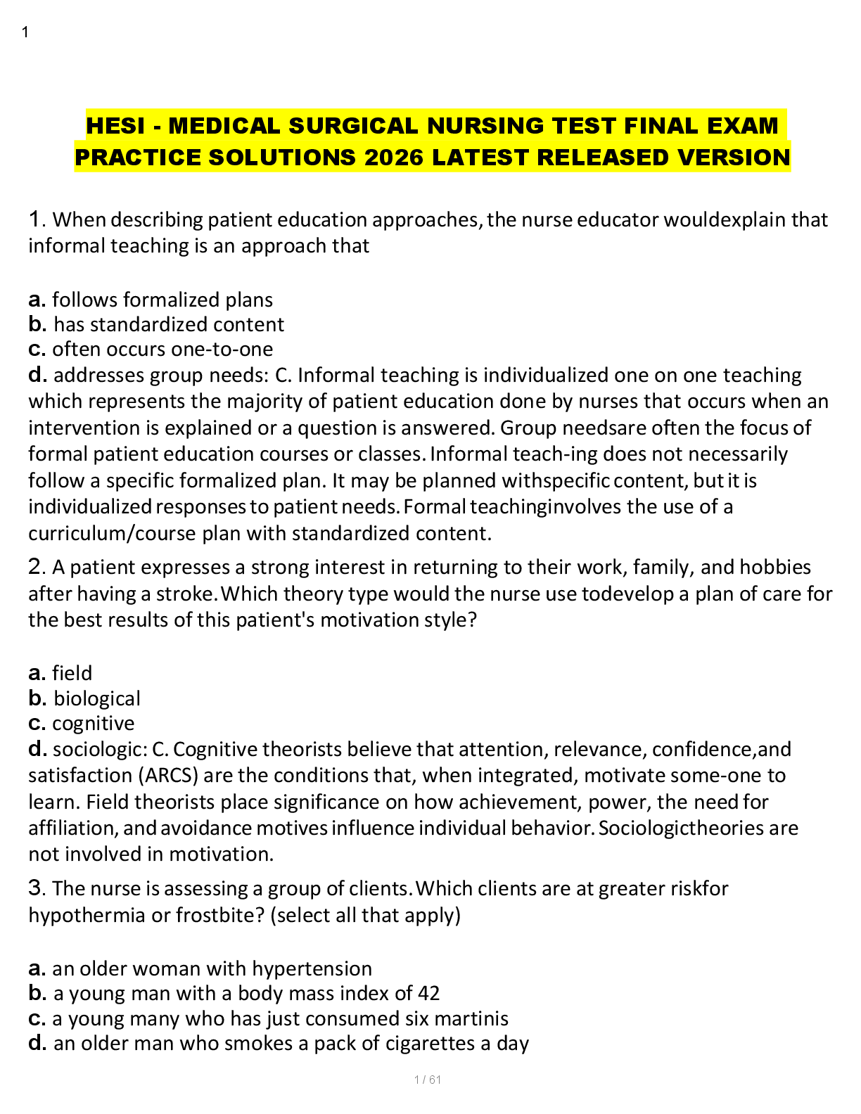 HESI MED-SURG > HESI MED SURG > HESI - MEDICAL SURGICAL NURSING TEST FINAL EXAM PRACTICE SOLUTIONS 2026 LATEST RELEASED VERSION