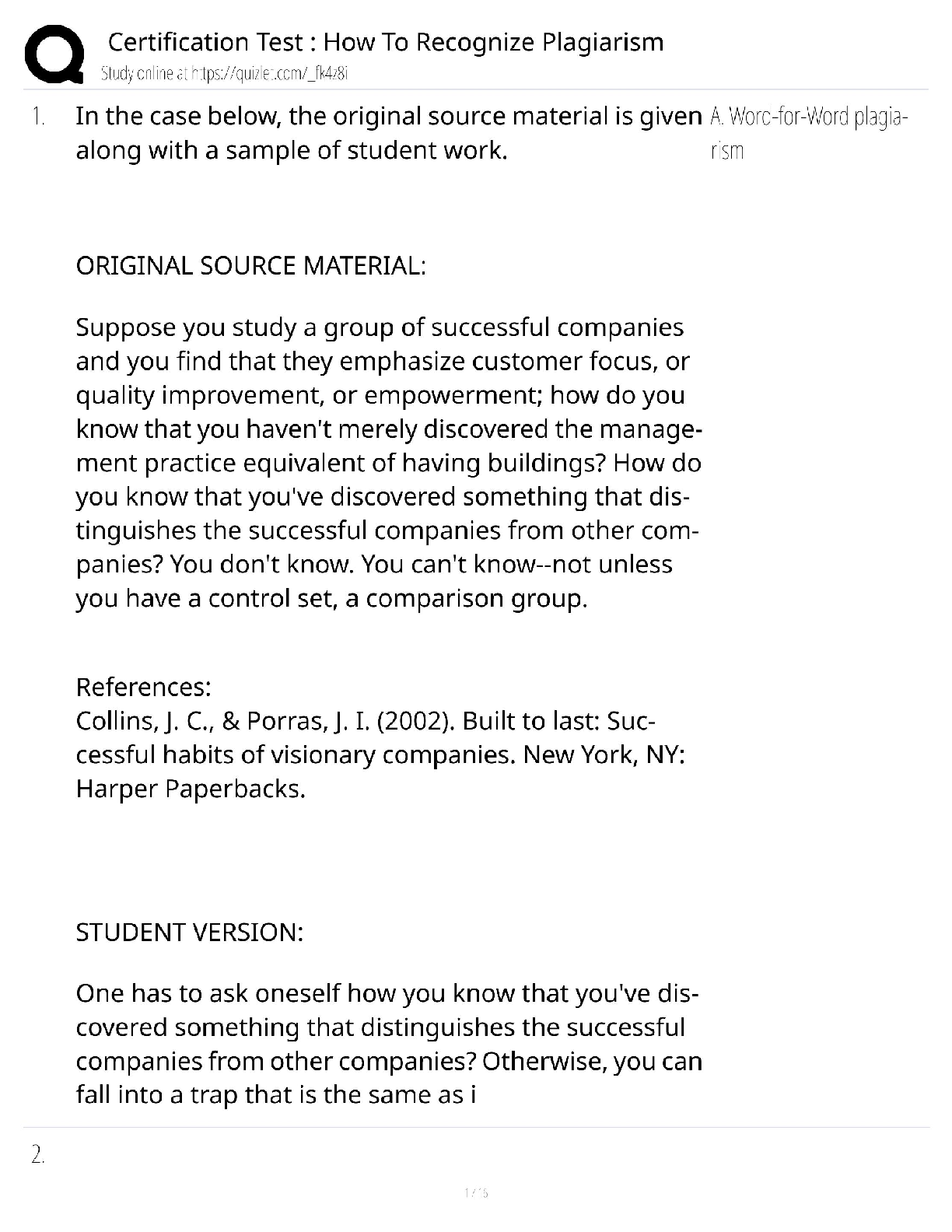 Education > QUESTIONS & ANSWERS > Plagiarism Certification Test 2025 / Recognize & Avoid Plagiarism / Score 100% / Quiz & Examples