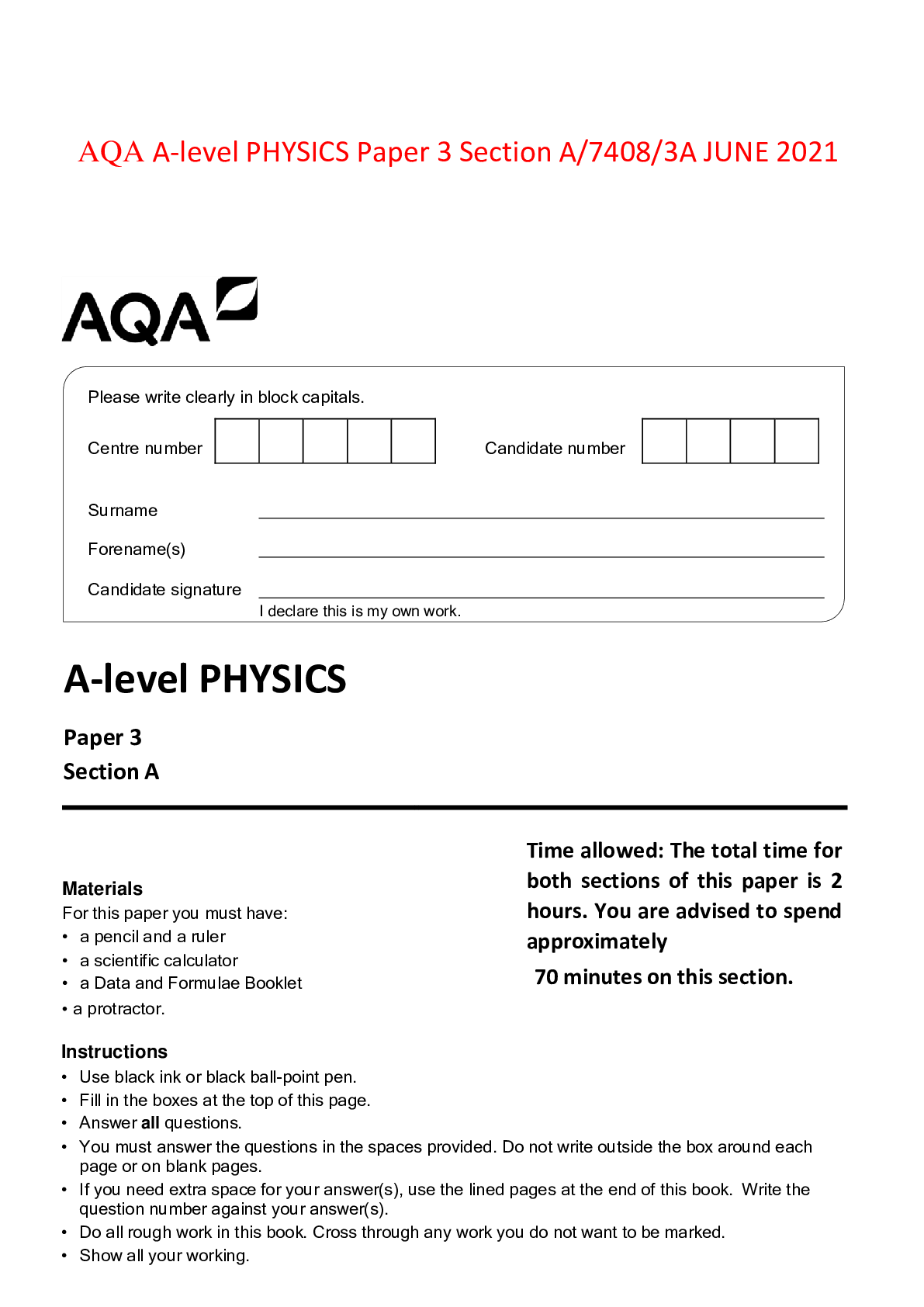 Iodine-131 has 6 more neutrons (than iodine-125) Condone iodine-131 has 78 neutrons and iodine-125 has 72 neutrons. Condone “6 fewer/less neutrons than iodine-131” Do not credit nucleons. ... Suggestion of difference in number of protons loses the mark. 1 01.2 131 (nucleons) If more than one number is given, the nucleon number must be explicit. 1 01.3 The tellurium has 1 more neutron (than iodine-125) The tellurium has 1 fewer proton (than iodine-125) Accept reverse arguments. Accept tellurium has 73 neutrons Accept tellurium has 52 protons Condone “proton number”. Condone “number of neutrons/protons have increased/decreased by one" Treat any nuclear reactions as neutral. Discussion of electrons in nucleus scores max 1. Accept answer in terms of quarks (one more down and one fewer up). Ignore references to nucleons/mass number. 2 MARK SCHEME – A-LEVEL PHYSICS – 7408/1 – JUNE 2019 5 01.4 A (internal conversion: only electron released); beta-decay: (electron and) anti-neutrino released; B (both statements required for mark) internal conversion: all electrons released will have similar/discrete energies/momenta beta-decay: electrons will have a range of energies/momenta C (internal conversion: no change in constituents of nucleus/element does not change) beta-decay: neutron converted to proton (allow in terms of quarks)/element changes (to one with (one) more p, different Z, different proton number/different atomic number)) D (internal conversion: orbital electron lost) beta-decay: electron comes from nucleus / no change in orbital electrons E (both statements required for mark) internal conversion: mediated by electromagnetic force / virtual photons beta-decay: mediated by weak interaction / W– Any 3. Treat each difference, as delimited by the answer book, as a single independent mark. Contradiction within a difference cancels the mark for that difference (on list basis). For a contradiction between separate differences treat the incorrect difference as neutral. Allow: F (both statements required for mark) Internal conversion: may be accompanied by X-ray photon Beta-decay: may be accompanied by gamma photon Allow “shells” for “orbitals”. Do not award separate marks for force and exchange particle Condone “W boson” or “W particle” but not W+ and W ......................CONTINUED [Show More]