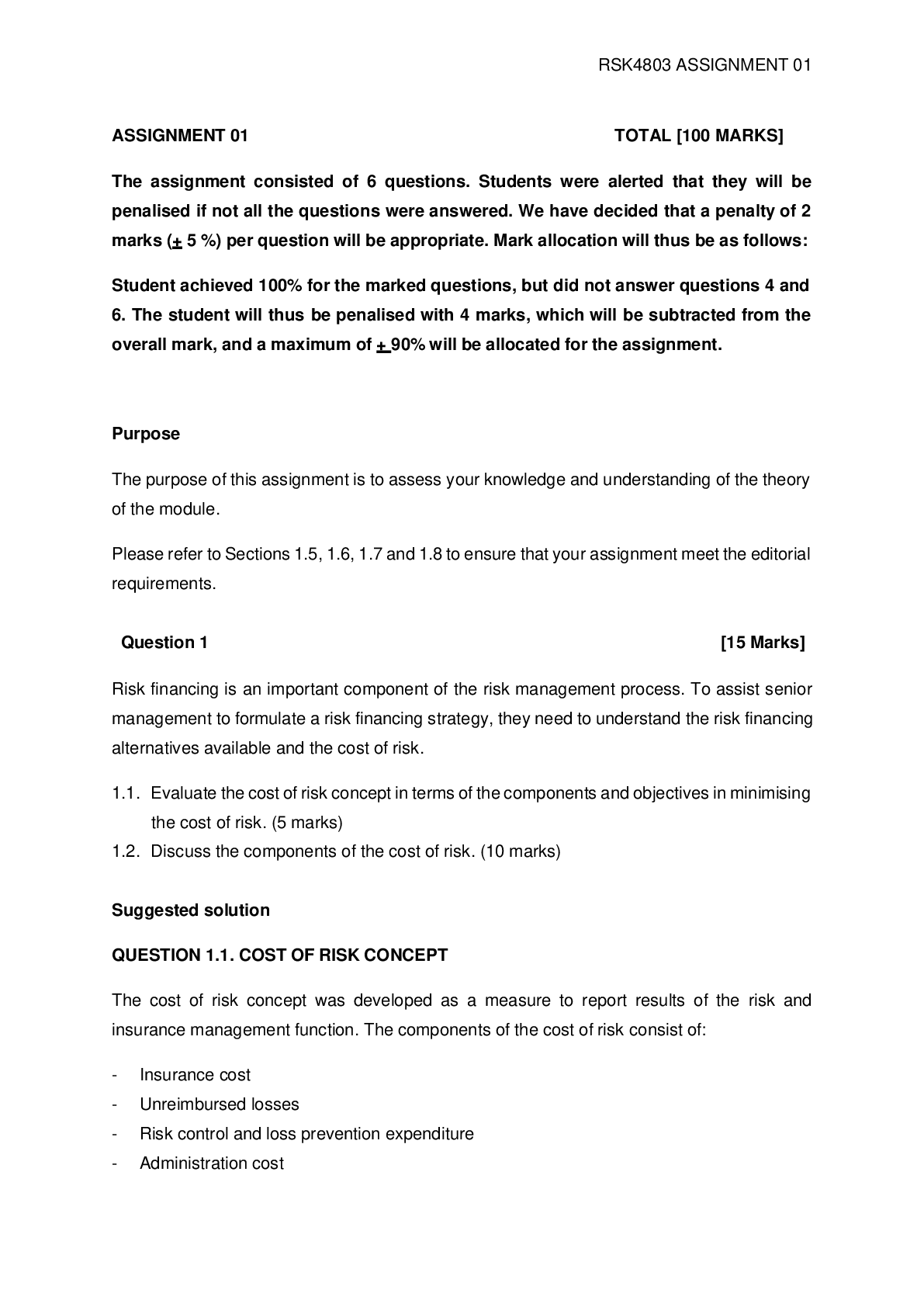 ASSIGNMENT 01 TOTAL [100 MARKS] The assignment consisted of 6 questions. Students were alerted that they will be penalised if not all the questions were answered. We have decided that a penalty of ... 2 marks (+ 5 %) per question will be appropriate. Mark allocation will thus be as follows: Student achieved 100% for the marked questions, but did not answer questions 4 and 6. The student will thus be penalised with 4 marks, which will be subtracted from the overall mark, and a maximum of + 90% will be allocated for the assignment. Purpose The purpose of this assignment is to assess your knowledge and understanding of the theory of the module. Please refer to Sections 1.5, 1.6, 1.7 and 1.8 to ensure that your assignment meet the editorial requirements. Question 1 [15 Marks] Risk financing is an important component of the risk management process. To assist senior management to formulate a risk financing strategy, they need to understand the risk financing alternatives available and the cost of risk. 1.1. Evaluate the cost of risk concept in terms of the components and objectives in minimising the cost of risk. (5 marks) 1.2. Discuss the components of the cost of risk. (10 marks) Suggested solution QUESTION 1.1. COST OF RISK CONCEPT The cost of risk concept was developed as a measure to report results of the risk and insurance management function. The components of the cost of risk consist of: - Insurance cost - Unreimbursed losses - Risk control and loss prevention expenditure - Administration cost Objectives in minimising the cost of risk To minimise the cost of risk, the following should be considered: - Adoption of a long term view of when cost to benefit trade off related to the levels of risk control expenditure - Risk control should be undertaken within the limits dictated by broad corporate financing objectives and constraints - Risk financing decisions should be taken with due reference to the investment decision QUESTION 1.2. COMPONENTS OF THE COST OF RISK Insurance costs Direct insurance costs – directly related to the total of all insurance premiums. • Other aspects must be taken into account to determine the actual cost of insurance. These include opportunity cost of the funds expended as insurance premiums. The tax implications of premiums and claims, and the cost of capital relative to the value of the expected claims. • Costs of statutory insurance – e.g. Worker’s compensation and unemployment insurance but reduce the cost by claims recoveries. ................................................................................continued................................................................................... [Show More]