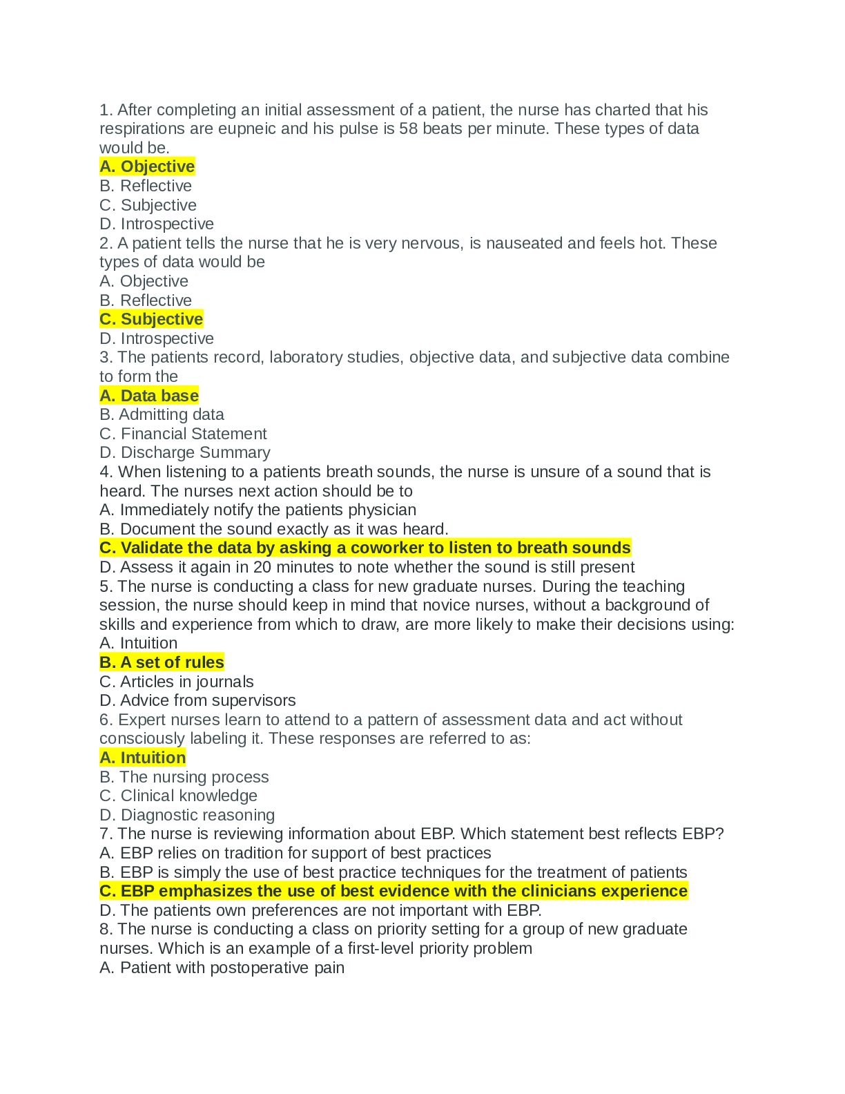 Chapter 01: Evidence Based Assessment MULTIPLE CHOICE 1. After completing an initial assessment of a patient, the nurse has charted that his respirations are eupneic and his pulse is 58 beats per...