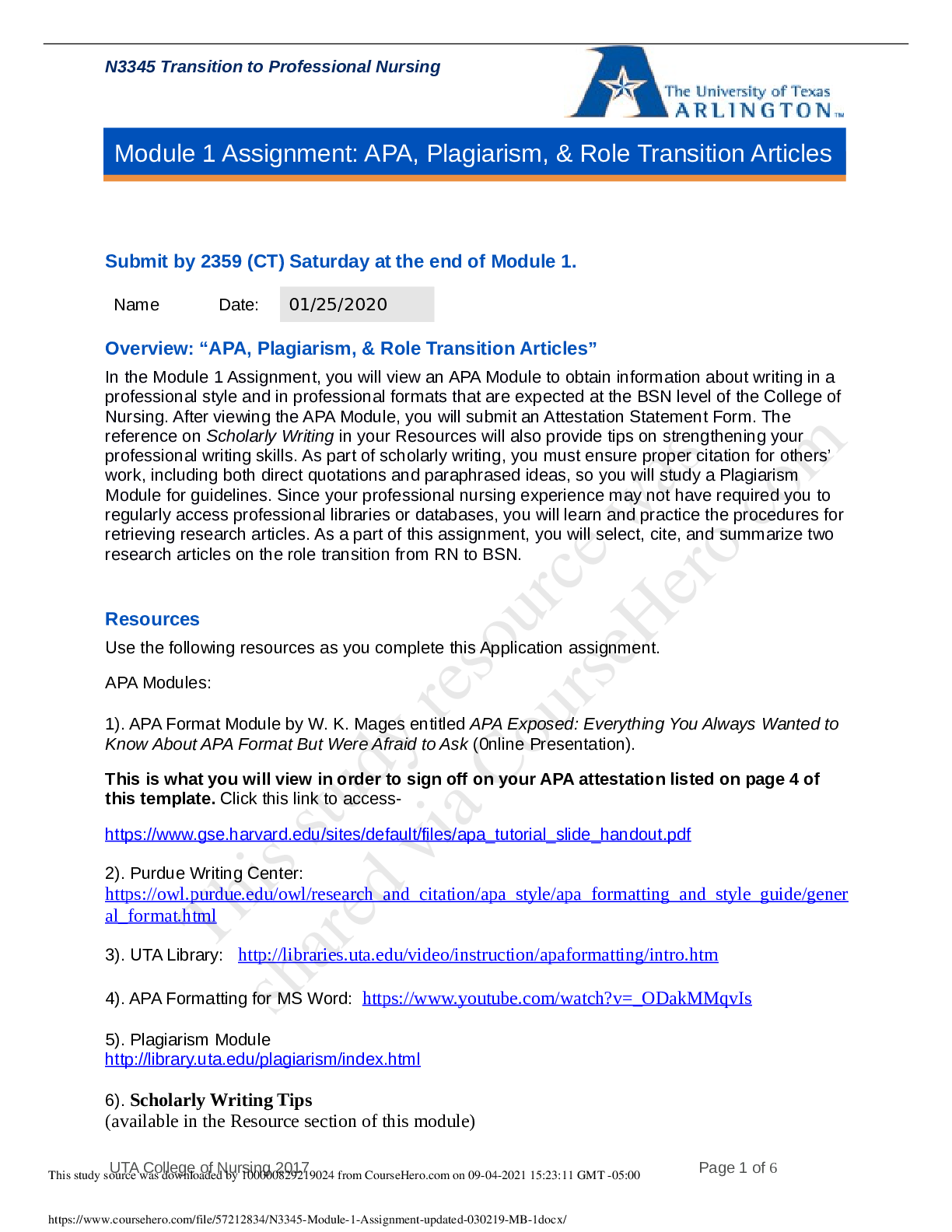 N3345 Transition to Professional Nursing Submit by 2359 (CT) Saturday at the end of Module 1. Name Date: 01/25/2020 Overview: “APA, Plagiarism, & Role Transition Articles” In the Module 1 Assi ... gnment, you will view an APA Module to obtain information about writing in a professional style and in professional formats that are expected at the BSN level of the College of Nursing. After viewing the APA Module, you will submit an Attestation Statement Form. The reference on Scholarly Writing in your Resources will also provide tips on strengthening your professional writing skills. As part of scholarly writing, you must ensure proper citation for others’ work, including both direct quotations and paraphrased ideas, so you will study a Plagiarism Module for guidelines. Since your professional nursing experience may not have required you to regularly access professional libraries or databases, you will learn and practice the procedures for retrieving research articles. As a part of this assignment, you will select, cite, and summarize two research articles on the role transition from RN to BSN. Resources Use the following resources as you complete this Application assignment. APA Modules: 1). APA Format Module by W. K. Mages entitled APA Exposed: Everything You Always Wanted to Know About APA Format But Were Afraid to Ask (0nline Presentation). This is what you will view in order to sign off on your APA attestation listed on page 4 of this template. Click this link to access- https://www.gse.harvard.edu/sites/default/files/apa_tutorial_slide_handout.pdf 2). Purdue Writing Center: https://owl.purdue.edu/owl/research_and_citation/apa_style/apa_formatting_and_style_guide/gener al_format.html 3). UTA Library: http://libraries.uta.edu/video/instruction/apaformatting/intro.htm 4). APA Formatting for MS Word: https://www.youtube.com/watch?v=_ODakMMqvIs 5). Plagiarism Module http://library.uta.edu/plagiarism/index.html 6). Scholarly Writing Tips (available in the Resource section of this module) UTA College of Nursing 2017 Page 1 of 6 [Show More]