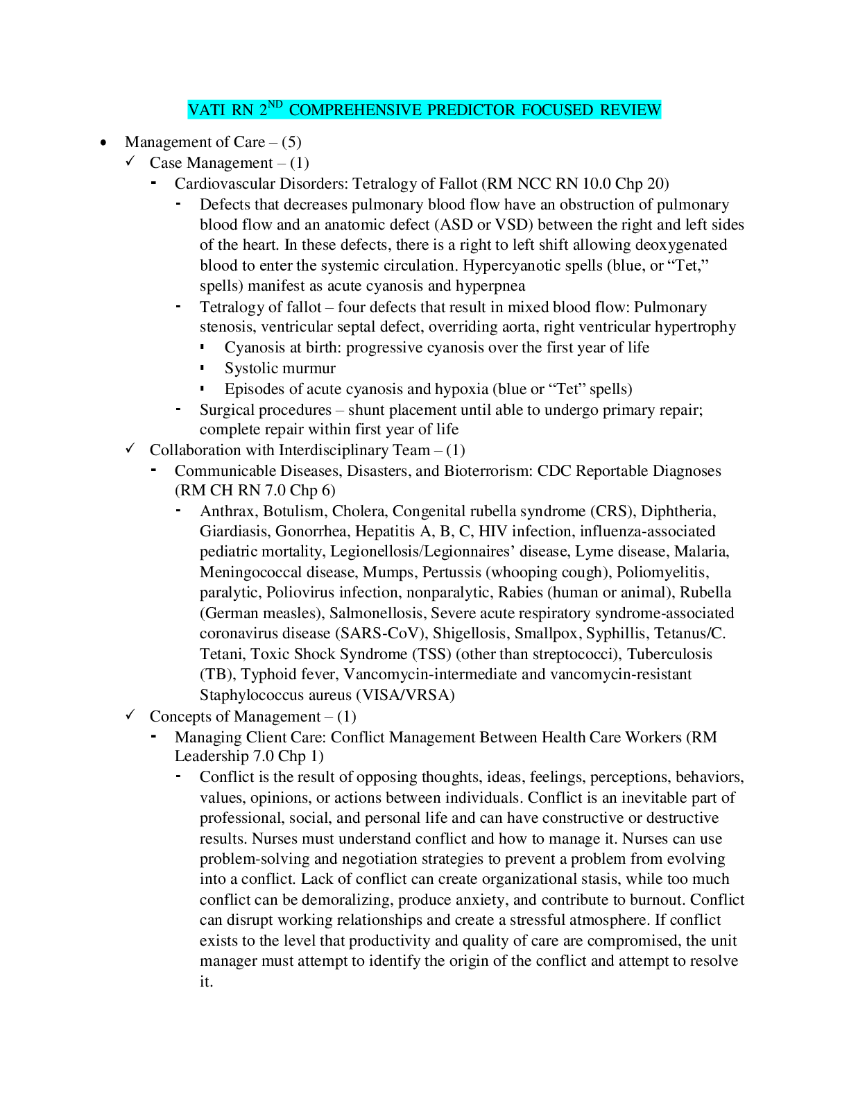 VATI RN 2ND COMPREHENSIVE PREDICTOR FOCUSED REVIEW ❖ Management of Care – (5) ➢ Case Management – (1) ▪ Cardiovascular Disorders: Tetralogy of Fallot (RM NCC RN 10.0 Chp 20) • Defects ... that decreases pulmonary blood flow have an obstruction of pulmonary blood flow and an anatomic defect (ASD or VSD) between the right and left sides of the heart. In these defects, there is a right to left shift allowing deoxygenated blood to enter the systemic circulation. Hypercyanotic spells (blue, or “Tet,” spells) manifest as acute cyanosis and hyperpnea • Tetralogy of fallot – four defects that result in mixed blood flow: Pulmonary stenosis, ventricular septal defect, overriding aorta, right ventricular hypertrophy ◆ Cyanosis at birth: progressive cyanosis over the first year of life ◆ Systolic murmur ◆ Episodes of acute cyanosis and hypoxia (blue or “Tet” spells) • Surgical procedures – shunt placement until able to undergo primary repair; complete repair within first year of life ➢ Collaboration with Interdisciplinary Team – (1) ▪ Communicable Diseases, Disasters, and Bioterrorism: CDC Reportable Diagnoses (RM CH RN 7.0 Chp 6) • Anthrax, Botulism, Cholera, Congenital rubella syndrome (CRS), Diphtheria, Giardiasis, Gonorrhea, Hepatitis A, B, C, HIV infection, influenza-associated pediatric mortality, Legionellosis/Legionnaires’ disease, Lyme disease, Malaria, Meningococcal disease, Mumps, Pertussis (whooping cough), Poliomyelitis, paralytic, Poliovirus infection, nonparalytic, Rabies (human or animal), Rubella (German measles), Salmonellosis, Severe acute respiratory syndrome-associated coronavirus disease (SARS-CoV), Shigellosis, Smallpox, Syphillis, Tetanus/C. Tetani, Toxic Shock Syndrome (TSS) (other than streptococci), Tuberculosis (TB), Typhoid fever, Vancomycin-intermediate and vancomycin-resistant Staphylococcus aureus (VISA/VRSA) ➢ Concepts of Management – (1) ▪ Managing Client Care: Conflict Management Between Health Care Workers (RM Leadership 7.0 Chp 1) • Conflict is the result of opposing thoughts, ideas, feelings, perceptions, behaviors, values, opinions, or actions between individuals. Conflict is an inevitable part of professional, social, and personal life and can have constructive or destructive results. Nurses must understand conflict and how to manage it. Nurses can use problem-solving and negotiation strategies to prevent a problem from evolving into a conflict. Lack of conflict can create organizational stasis, while too much conflict can be demoralizing, produce anxiety, and contribute to burnout. Conflict can disrupt working relationships and create a stressful atmosphere. If conflict exists to the level that productivity and quality of care are compromised, the unit manager must attempt to identify the origin of the conflict and attempt to resolve it. ................................................................................continued............................................................................................. [Show More]
