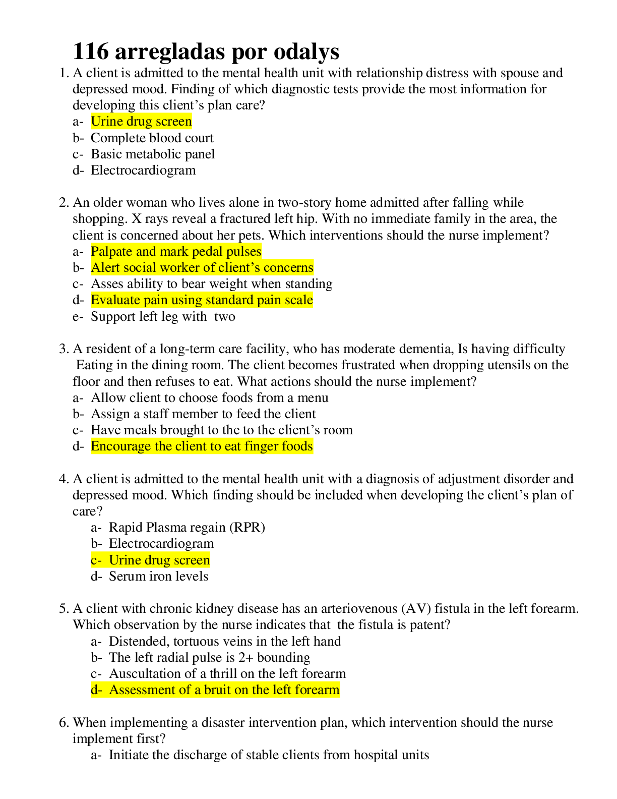 NR 508 Final Exam study guide (A guaranteed) Cardiovascular management: 1. Know Initial treatment choices for HTN AceI- sartans Arbs- ipine, verapamil & diltazem Thiazide- iaside, chlorthalidone, ... imdapamide, metolazone calcium channel blocker 2. Know first line treatment options for HTN for African Americans without renal impairment. Calcium channel blockers Thiazide 3. First line option for HTN for anyone with chronic kidney disease Ace inhibitors ARB’s Diuretics: 4. Types, Uses, Side effects Thiazides (HCTZ) Uses- HTN, CHF, edema, useful in decreases calcium stone formation Off label HCTZ- osteoporosis and diabetes AE- hypokalemia, hyperglycemia, arrhythmias, metabolic alkalosis, fatigue, postural Hypotension Loop diuretics (furosemide, torsemide, ethacrynic acid) *preferred diuretics for renal Impairment Uses- CFH, HTN, nephrotic syndrome, cirrhosis, pulmonary edema AE-hypocalcemia, hyponatremia, hypokalemia, ototoxicity Carbonic anhydrase inhibitors (acetazolamide) *weak diuretic Uses- edema, epilepsy, glaucoma, mountain sickeness AE- toxic epidermal necrolysis, agranulocytosis, aplastic anemia, thrombocytopenia, metabolic acidosis Potassium-sparing (spironolactone, eplerenone) Uses- CHF (in combo with thiazides or ACE and loop), HTN AE-gynomastia, n/v, erectile dysfuction, electrolyte imbalance, metabolic acidosis **postdiuretic sodium retention- It is important for pts to adhere to a low sodium diet. As drug concentrations fall, there is a period of positive sodium balance ** If a pt has a sulfa allergy= take ethacrynic acid 5. Preferred diuretic with renal impairment- Loop diuretics because they retain efficacy even with moderate renal insufficiency: such as furosemide, buetanide, torsemide, ethacrynic acid. Uses: Edematous states (HF, cirrhosis, pulmonary edema, nephrotic syndrome), hypercalcemia [Show More]