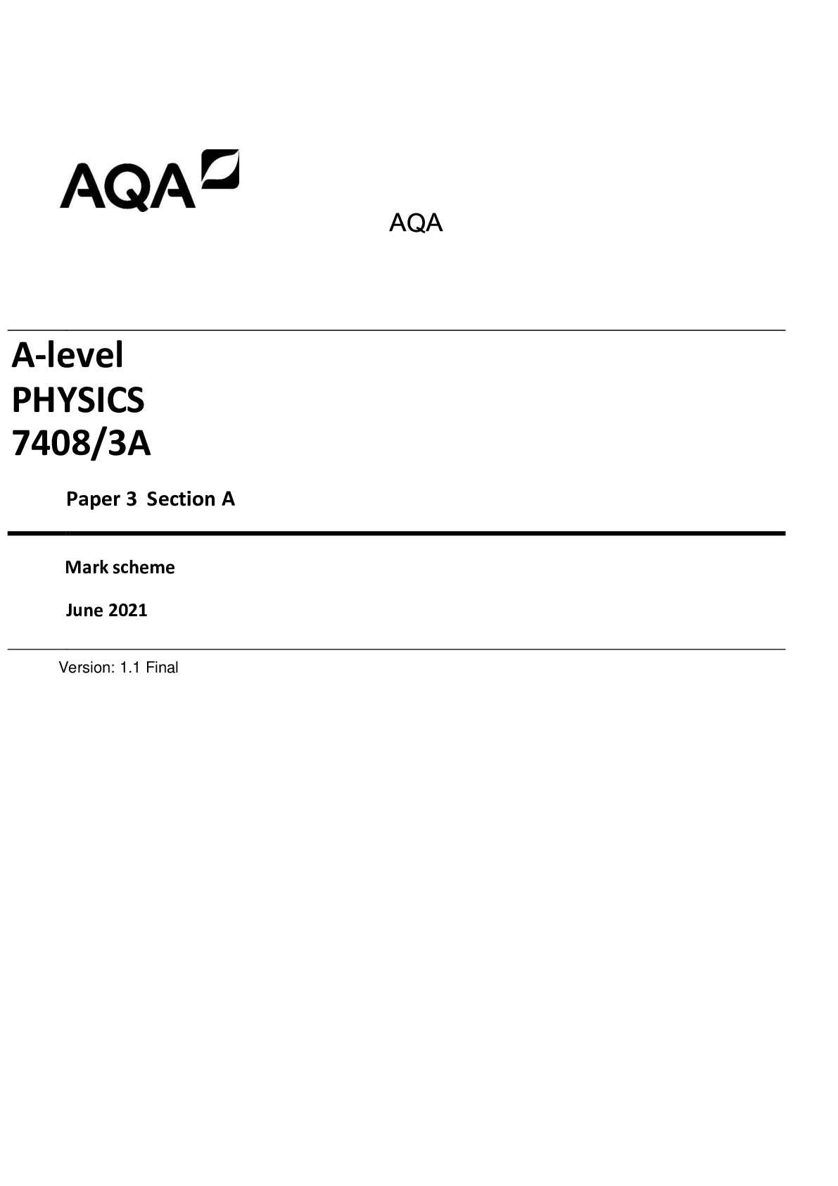 Physics > A-Level Mark Scheme > AQA A-level PHYSICS 7408/1 Paper 1 Mark scheme June 2021 (All)