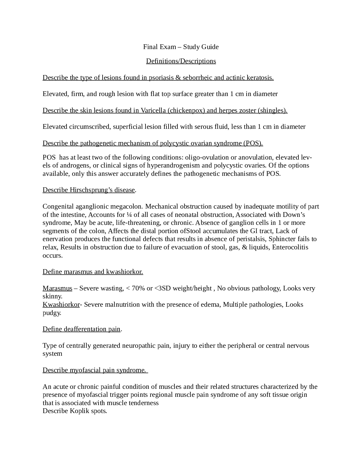 Study Guide for PN 161 Practical Nursing III Final Exam Module 1 and 2 1. Identify how to properly assess a client using the Glasgow coma scale and important nursing interventions related to sc ... oring. a. The Glasgow coma scale measures eye opening, verbal response, and motor response i. Monitor for improvements or worsening signs b. See level of consciousness! c. 3 is the lowest score d. Highest score 15 e. A score of 7 or less is considered a state of coma 2. Understand important considerations for neurological assessments. a. Health history i. Headaches ii. Clumsiness iii. Loss or change in function of extremity iv. Seizure activity v. Numbness or tingling vi. Change in vision vii. Pain viii. Extreme fatigue ix. Personality changes or mood swings 3. Review the physiology of CNS, PNS, and sympathetic/parasympathetic nervous systems. a. CNS i. Brain 1. Controls, initiates, and integrates body functions ii. Spinal cord 1. Carries sensory impulses a. Cerebrospinal fluid i. Absorbs shock b. PNS i. Somatic nervous system 1. Conscious activities ii. Autonomic nervous system 1. Unconsciousness activity iii. Spinal nerves 1. Reflex activity c. Sympathetic i. Neurological 1. Pupils dilated 2. Heightened awareness 3. Fight or flight d. Parasympathetic i. Neurological 1. Pupils normal size 2. Rest and digest 4. Identify important observations to include when assessing a pt.’s. mental status. a. Appearance b. Behavior c. Posture d. Mood e. Gestures f. Movements and facial expressions 5. Safety factors in Parkinson’s patients. a. Ambulation with assistance b. Provide an elevated toilet seat 6. S/S of encephalitis, meningitis and review nursing actions when caring for patients with them. a. Encephalitis i. Inflammation of brain ii. Fever, headache, nuchal rigidity, photophobia, irritability, lethargy, nausea/vomiting b. Meningitis i. Inflammation of meninges ii. Fever, headache, nuchal rigidity, photophobia, irritability, lethargy, and nausea/vomiting c. Nursing care i. Monitor for changes in neurological status ii. Quiet environment decreases external stimulation iii. Observe for seizure activity and protect from injury iv. Comfort measures offered 7. Post-op care of patient following back surgery. a. Monitor neurological status and vital signs b. Encourage client to cough, deep breathe, use incentive spirometer hourly, and move legs as allowed c. Provide adequate fluids to prevent renal stasis and constipation 8. List the S/S of herniated disks. a. Pain b. Motor changes c. Sensory changes d. Alterations in reflexes 9. S/S and exacerbations of them in MS patients. a. S/S of MS i. Vary according to the areas of demyelination ii. Vary from hour to hour or day to day iii. May be sensory, motor, or other disturbances 1. Visual disturbances 2. Numbness 3. Paresthesia 4. Pain 5. Decreased sense of temperature 6. Decreased muscle strength 7. Spasticity 8. Paralysis 9. Bowel and bladder incontinence or retention [Show More]
