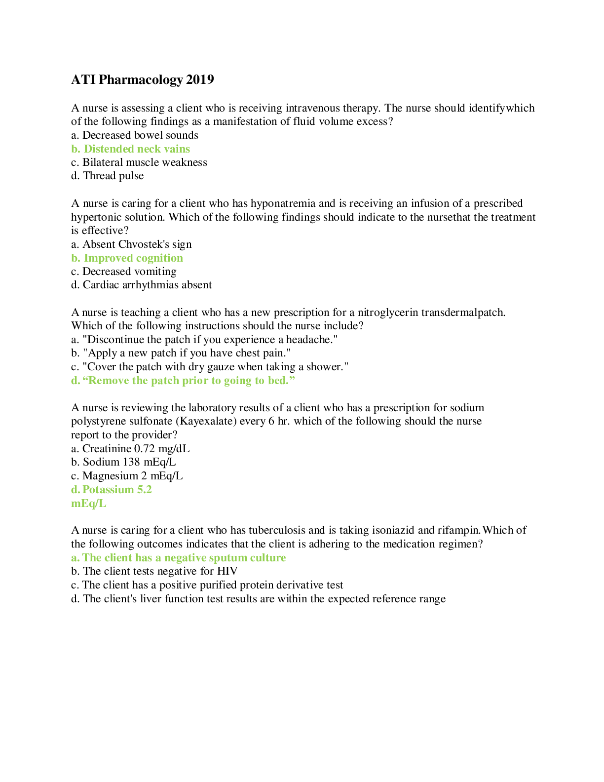 Prophecy PACU RN A v1 Questions & Answers, 2022 Meperidine (Demerol) 12.5mg every 15 minutes, IV prn is ordered for shivering in the PACU. Meperidine is available in 50mg/1ml. How many mililiters sh ... ould be given? - 0.25 mililiters Upon inspecting a patient's epidural insertion site, you notice swelling around the catheter. What should you do? - A) Position the patient on their side B) Place the patient in a prone position C) Check the epidural line for kinks ***D) Contact the anesthesia provider What set of findings indicates a patient is likely to be ready for phase 1 discharge? - A) Has received discharge instructions, pain level 9 out 10, shortness of breath B) Drowsy, blood pressure returned to preoperative levels, on 6 liters oxygen via face mask ***C) Drowsy, oxygen saturation of 96%, able to cough, and move all extremities D) Fully alert, shallow breathing, on 3 liters via T-piece, can move 2 extremities What do you consider to be a safe dose of intravenous fentanyl for an adult who does not have tolerance to opioids? - A) 1.5 miligrams ***B) 25 micrograms C) 100 micrograms D 25 miligrams Your patient in the PACU has a blood pressure of 171/92 mmHg, a heart rate of 120, respiratory rate of 24, is grimacing, restless, and moaning in bed. What medication should you prepare to give FIRST? - A) 10 mg hydralazine IV push ***B) 50 mcg fentanyl IV push C) 2 mg lorazepam IV push D) 5 mg metoprolol IV push You are about to discharge a day surgery patient with aphasia and you discover the family members are not available for the discharge instructions and are not responding to your phone calls. Business hours are over and the PACU is about to close. How will you handle the situation? - ***A) Wait until the family returns B) Leave the discharge education on voicemail and discharge patient [Show More]