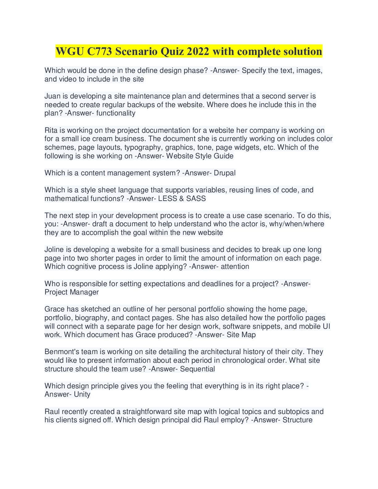 WGU C773 User Interface Design Exam Review 2022 with complete solution A well-designed navigation system enables users to move between sections and pages of a site in an orderly manner guided by: ... A. a breadcrumb system of navigation. B. flashy dropdown menus and options. C. a series of blue, underlined hyperlinks. D. a clear mental model of the underlying site structure. -Answer- A clear mental model of the underlying site structure. Which of the following describes the Main Success Scenario element of a use case document? A. The state of the system after the goal is met. B. What page will be displayed when a user successfully purchases an item. C. What pages and in what order, a user will click on to achieve his or her goal. D. What the actor needs to do to meet the goal. -Answer- What the actor needs to do to meet the goal. After reviewing your Web site it has been determined that your site has both ethical and legal violations. Which of the following is not only unethical but illegal as well? Overcharging customers for technical services that they do not understand Using copyrighted materials without permission Spreading malicious code such as viruses, worms or Trojan horses Sending unsolicited bulk e-mail messages to users who did not request them -Answer- Using copyrighted materials without permission. Spreading malicious code such as viruses, worms or Trojan horses Which of the following is not considered a well-established site navigation convention? A. Including a contact page that visitors can use to get in touch with the site owner B. Including copyright and privacy information on the footer of the site map only C. Including primary navigation on every page D. Including a Home page at the root of the site structure -Answer- Include copyright and privacy information on the footer of the site map only All major browsers facilitate fine-tuning and debugging of your code by providing built-in developer tools. Which developer tool will you use to help you optimize your page performance in regards to load time, render time and memory usage? A. Resource tools B. HTML and CSS tools C. Performance tools D. Telnet tools -Answer- Performance tools Web designers and developers are like the two hemispheres of a single Web site-creation brain: the designer is the right hemisphere (creative, imaginative and intuitive), • while the developer is the left hemisphere (logical, linear and analytical), Which responsibility listed lies on the designer? A. Converting UI sketches to wireframes and wireframes into page mockups B. Choosing the most appropriate text, images and multimedia to achieve the site's goals C. Testing, revising and re-testing over and over D. Programming the front-end UI using HTML, CSS, JavaScript, etc -Answer- Converting UI sketches to wireframes and wireframes into page mockups Site maps are usually a set of text links laid out for structural clarity. For mid-size to large sites comprehensive site maps are put on their own pages. For smaller sites, however, they are often: A. not included at all B. built into page headers C. built into page footers D. revealed in the URL only -Answer- Built into page footers When gathering assets for the remaining site pages you decide to work in "batchpage mode." What does this mean? A. You gather a batch of assets, then you code a batch of pages, then you create a batch of assets, then you code a batch of pages. B. You gather/create the assets for all site pages, then move on to the next phase in the process: building the Web pages. C. You gather an asset for all of the site pages and then put the asset into the page and then move on to the next asset. D. You gather and create the assets for one page and then continue on working on that page and repeat this until the entire batch is done. -Answer- You gather/create the assets for all site pages, then move on to the next phase in the process: building the Web pages. Which of the following forms is typically the first point of communication with a new visitor to your site? A. CAPTCHA human verification B. Login-in form C. Search form D. Registration forms -Answer- Registration forms Which of the following would you not consider when creating your own custom SEO toolkit? A. Provide high-quality and regularly updated content. B. Remove alt attributes to all page images ( tags). C. Design pages to load and render quickly. D. Include search keywords in the page title and headings. -Answer- Remove alt attributes to all page images Web analytic tools can give you valuable data in optimizing Web usage. Which of the following information is collected, measured and analyzed by Web analytics? A. How much users enjoyed your site B. Search engine optimization and marketing analysis C. What products were purchased most often D. any HTML and JavaScript coding errors -Answer- Search engine optimization and marketing analysis You are the Project Manager overseeing the development of a large site. During which project phase would you expect to determine the type of navigation your site will include? A. Design phase B. Initial phase C. Planning phase D. Development phase -Answer- Planning phase As a professional coder you enclose your navigation section of your Web page in which HTML5 elements? A. <section>...</section> B. <header>...</header> C. <nav>...</nav> D. <aside>...</aside> -Answer- <nav>...</nav> [Show More]