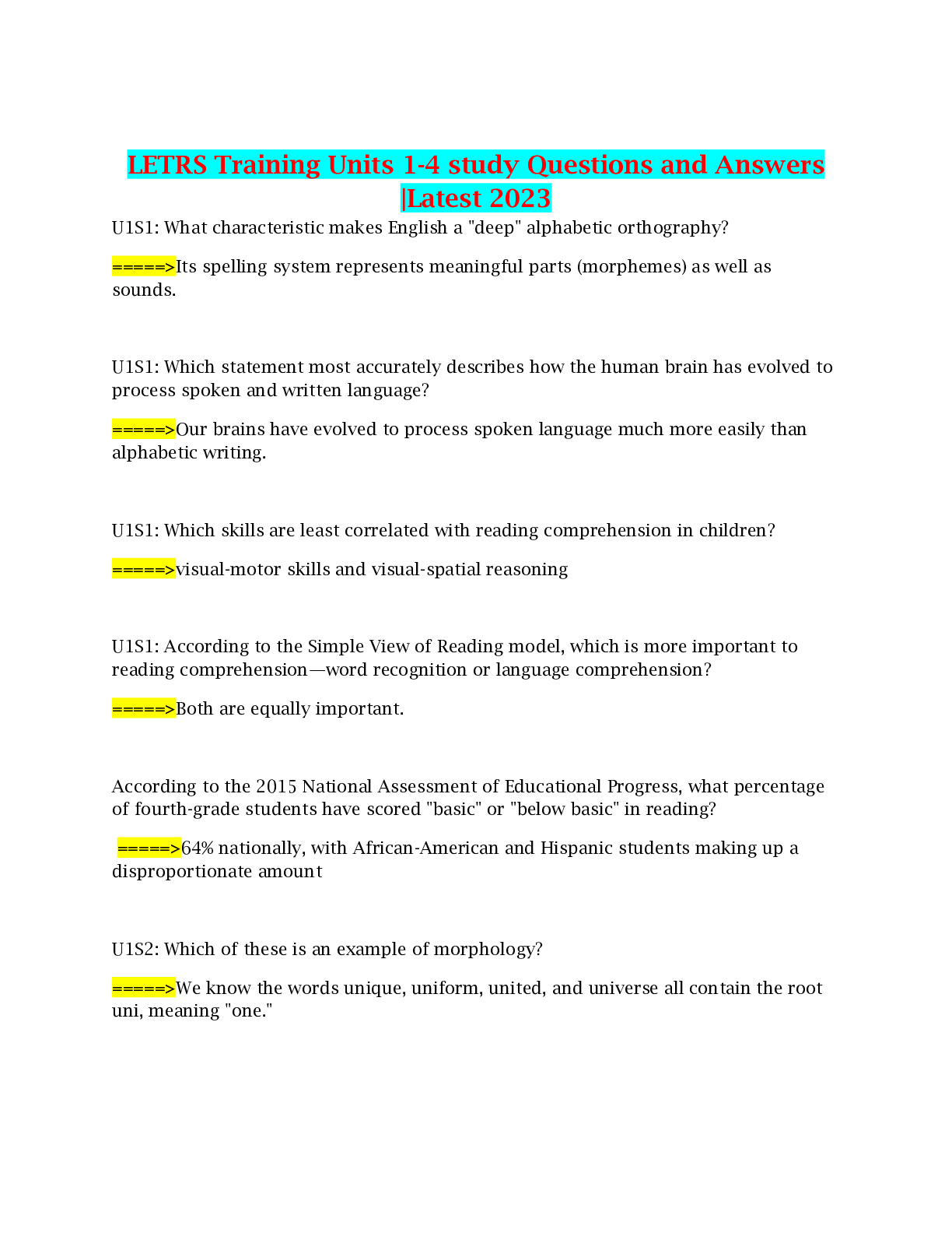 What characteristic makes English a "deep" alphabetic orthography? - ANS - Its spelling system represents meaningful parts (morphemes) as well as sounds. Which statement most accurately describes ho ... w the human brain has evolved to process spoken and written language? - ANS - Our brains have evolved to process spoken language much more easily than alphabetic writing. Which skills are least correlated with reading comprehension in children? - ANS - visual-motor skills and visual-spatial reasoning According to the Simple View of Reading model, which is more important to reading comprehension—word recognition or language comprehension? - ANS - Both are equally important. According to the 2015 National Assessment of Educational Progress, what percentage of fourthgrade students have scored "basic" or "below basic" in reading? - ANS - 64% nationally, with African-American and Hispanic students making up a disproportionate amount Which of these is an example of morphology? - ANS - We know the words unique, uniform, united, and universe all contain the root uni, meaning "one." How does the language system of pragmatics help us to understand why written language is more structured than spoken language? - ANS - Social context and nonverbal gestures help [Show More]