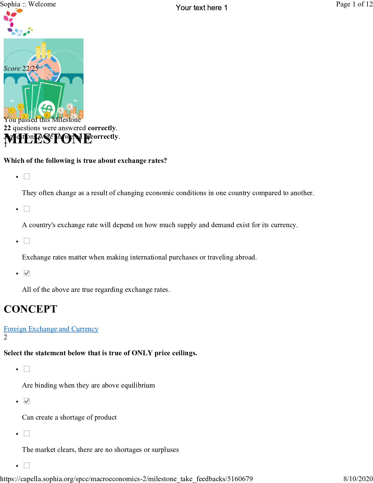 Which of the following is true about exchange rates? • They often change as a result of changing economic conditions in one country compared to another. • A country's exchange rate will depend ... on how much supply and demand exist for its currency. • Exchange rates matter when making international purchases or traveling abroad. • All of the above are true regarding exchange rates. CONCEPT Foreign Exchange and Currency 2 Select the statement below that is true of ONLY price ceilings. • Are binding when they are above equilibrium • Can create a shortage of product • The market clears, there are no shortages or surpluses • Sophia :: Welcome Page 1 of 12https://capella.sophia.org/spcc/macroeconomics-2/milestone_take_feedbacks/5160679 8/10/2020Your text here 1 The market is allowing for trade to occur between buyers and sellers CONCEPT Binding & Non-Binding Constraints 3 Which statement below about expansionary fiscal policy is true? • It generally has a negative effect on GDP. • If it is based on a tax cut, it will trigger the multiplier effect. • It could include lowering interest rates. • It could include decreasing the reserve requirement. CONCEPT Expansionary Policy 4 If the reserve requirement for a bank is 25%, $15 in M0 will lead to which of the following amounts of money of M1? • $45 • $4 • $15 • $60 CONCEPT Reserve Requirement 5 Laura is willing to pay as much as $1,000 for a wedding dress but is happy to find one she likes that costs $300. Select the term below that corresponds to this situation. Sophia :: Welcome Page 2 of 12https://capella.sophia.org/spcc/macroeconomics-2/milestone_take_feedbacks/5160679 8/10/2020 • Consumer surplus • Equilibrium • Ceteris paribus • Producer surplus CONCEPT Consumer Surplus 6 Private loan seekers getting crowded out of the loan market by the government is a(n) __________. • criticism of fiscal policy • advantage of fiscal policy • criticism of monetary policy • advantage of monetary policy CONCEPT Pros and Cons of Monetary and Fiscal Policy 7 Which statement below about producer surplus is NOT true? • When producer surplus drops to zero, firms stop producing. • Producer surplus is basically the same a [Show More]