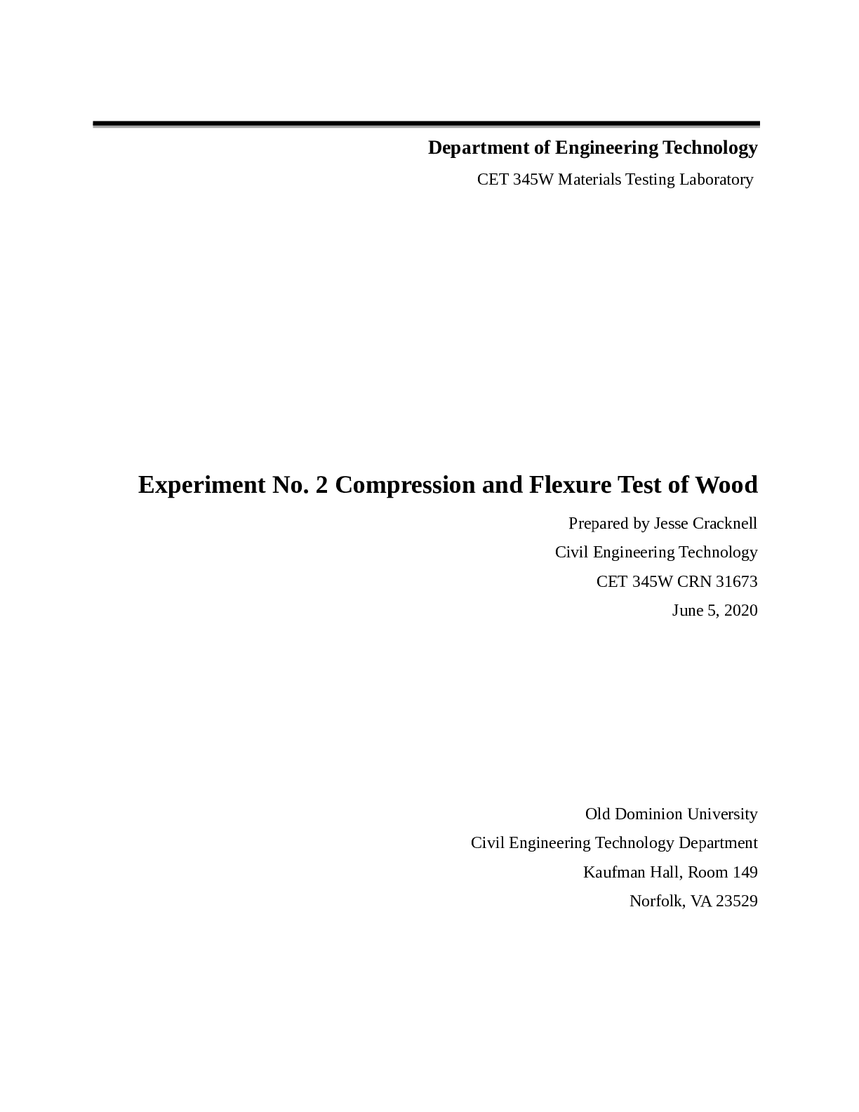 Department of Engineering Technology CET 345W Materials Testing Laboratory Experiment No. # Impact TestKeith Pugh Mechanical Engineering Technology Old Dominion University June 21, 2019 Old Domini ... on University Civil Engineering Technology Department Kaufman Hall, Room 149 Norfolk, VA 23529Table of Contents 1. Summary …………………………………………….…………………………… 2 2. Procedure ……….………………………………………………………………… 3 3. Equipment ……………………..………………….……………………………… 4 4. Experiment Requirements ….……..………………………………………………. 5 5. Required Data ……………..…….………………….…………………………….. 6 6. Sample Calculations …..……..…….……………….…………………………….. 7 7. Test Results ……………………………………….………………………………. 8 8. Conclusions/Analysis …………………………….………………………………. 9 [Show More]