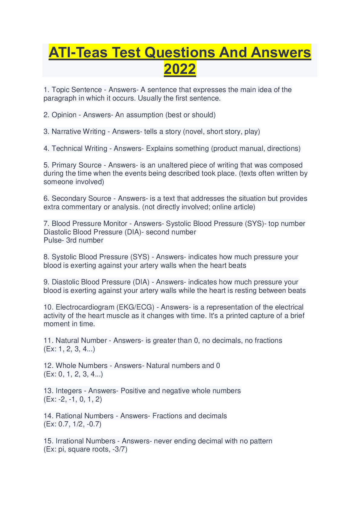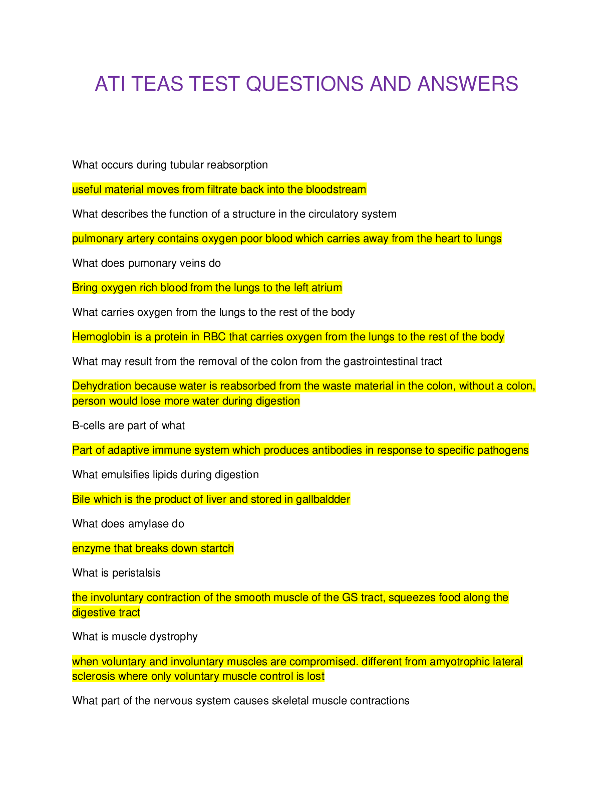 ATI TEAS TEST QUESTIONS AND ANSWERS What occurs during tubular reabsorption useful material moves from filtrate back into the bloodstream What describes the function of a structure in the circu ... latory system pulmonary artery contains oxygen poor blood which carries away from the heart to lungs What does pumonary veins do Bring oxygen rich blood from the lungs to the left atrium What carries oxygen from the lungs to the rest of the body Hemoglobin is a protein in RBC that carries oxygen from the lungs to the rest of the body What may result from the removal of the colon from the gastrointestinal tract Dehydration because water is reabsorbed from the waste material in the colon, without a colon, person would lose more water during digestion B-cells are part of what Part of adaptive immune system which produces antibodies in response to specific pathogens What emulsifies lipids during digestion Bile which is the product of liver and stored in gallbaldder What does amylase do enzyme that breaks down startch What is peristalsis the involuntary contraction of the smooth muscle of the GS tract, squeezes food along the digestive tract What is muscle dystrophy when voluntary and involuntary muscles are compromised. different from amyotrophic lateral sclerosis where only voluntary muscle control is lost What part of the nervous system causes skeletal muscle contractions Somatic division controls the skeletal muscles of the body What hormone secreted by adrenal gland increases reabsorption of sodium ions aldosterone What is renal artery Branches of the abdominal aorta that supply the kidneys What results from a deficit in the production of thyrotropin releasing hormone Thyrotropin releasing hormone triggers the production of thyroid hormone from the thyroid gland, so thyroid gland doesnt produce a sufficient amount of its primary hormone What hormona is released and stimulates uterine contractions during childbirth oxytocin, made by hypothalamus and released by posterior pituitary What is positive feedback Mechanism that increases when product when reactants are increased Inhibited function of sweat glands can cause loss of the ability to regulate body temperature because sweating is a major mechanism of thermoregulation What adaptive immune system decreases the amount of time it takes for body to respond to an antigen Memory cells are a thype of lymphocyte that responds more quickly to an antigen upon reintroduction of the pathogen What warms the body via integumental thermoregulation cutaneous vasocontriction What is a result of inhibited osteoblast function at the epiphyseal plate mineralization will not occur in the location. osteoblasts are bone cells that produce secretions blocking the inhibition of mineralization What channels contain blood vessels and nerves in the bones Haversian canals aka central canal What happens when mineral resorption is prevented and calcium is not removed from bone What occurs during tubular reabsorption useful material moves from filtrate back into the bloodstream What describes the function of a structure in the circulatory system pulmonary artery contains oxygen poor blood which carries away from the heart to lungs What does pumonary veins do Bring oxygen rich blood from the lungs to the left atrium What carries oxygen from the lungs to the rest of the body Hemoglobin is a protein in RBC that carries oxygen from the lungs to the rest of the body What may result from the removal of the colon from the gastrointestinal tract Dehydration because water is reabsorbed from the waste material in the colon, without a colon, person would lose more water during digestion B-cells are part of what Part of adaptive immune system which produces antibodies in response to specific pathogens What emulsifies lipids during digestion Bile which is the product of liver and stored in gallbaldder What does amylase do enzyme that breaks down startch What is peristalsis the involuntary contraction of the smooth muscle of the GS tract, squeezes food along the digestive tract What is muscle dystrophy when voluntary and involuntary muscles are compromised. different from amyotrophic lateral sclerosis where only voluntary muscle control is lost What part of the nervous system causes skeletal muscle contractions Somatic division controls the skeletal muscles of the body What hormone secreted by adrenal gland increases reabsorption of sodium ions aldosterone What is renal artery Branches of the abdominal aorta that supply the kidneys What results from a deficit in the production of thyrotropin releasing hormone Thyrotropin releasing hormone triggers the production of thyroid hormone from the thyroid gland, so thyroid gland doesnt produce a sufficient amount of its primary hormone What hormona is released and stimulates uterine contractions during childbirth oxytocin, made by hypothalamus and released by posterior pituitary What is positive feedback Mechanism that increases when product when reactants are increased Inhibited function of sweat glands can cause loss of the ability to regulate body temperature because sweating is a major mechanism of thermoregulation What adaptive immune system decreases the amount of time it takes for body to respond to an antigen Memory cells are a thype of lymphocyte that responds more quickly to an antigen upon reintroduction of the pathogen What warms the body via integumental thermoregulation cutaneous vasocontriction What is a result of inhibited osteoblast function at the epiphyseal plate mineralization will not occur in the location. osteoblasts are bone cells that produce secretions blocking the inhibition of mineralization What channels contain blood vessels and nerves in the bones Haversian canals aka central canal What happens when mineral resorption is prevented and calcium is not removed from bone [Show More]