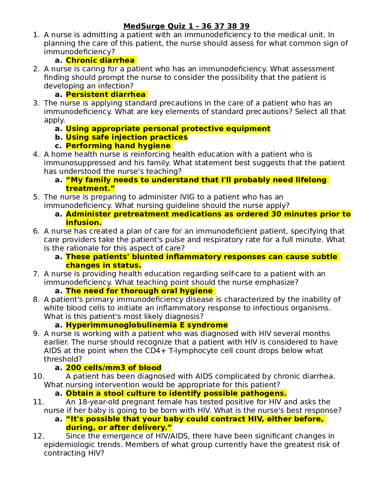 Saunders Medsurg Skin Integumentary Saunders Medsurg Skin Integumentary 1. A client calls the emergency department and tells the nurse that he came directly into contact with poison ivy shrubs. T ... he client tells the nurse that he cannot see anything on the skin and asks the nurse what to do. The nurse should make which response? 1. "Come to the emergency department." 2. "Apply calamine loton immediately to the exposed skin areas." 3. "Take a shower immediately, lathering and rinsing several tmes." 4. "It is not necessary to do anything if you cannot see anything on your skin." Answer: 3. "Take a shower immediately, lathering and rinsing several tmes." Ratonale: When an individual comes in contact with a poison ivy plant, the sap from the plant forms an invisible flm on the human skin. The client should be instructed to cleanse the area by showering immediately and to lather the skin several tmes and rinse each tme in running water. Removing the poison ivy sap will decrease the likelihood of irritaton. Calamine loton may be one product recommended for use if dermatts develops. The client does not need to be seen in the emergency department at this tme. 2. A client is being admited to the hospital for treatment of acute cellulits of the lower lef leg. During the admission assessment, the nurse expects to note which fnding? 1. An inflammaton of the epidermis only 2. A skin infecton of the dermis and underlying hypodermis 3. An acute superfcial infecton of the dermis and lymphatcs 4. An epidermal and lymphatc infecton caused by Staphylococcus Answer: 2. A skin infecton of the dermis and underlying hypodermis Ratonale: Cellulits is an infecton of the dermis and underlying hypodermis that results in a deep red erythema without sharp borders and spreads widely throughout tssue spaces. The skin is erythematous, edematous, tender, and sometmes nodular. Erysipelas is an acute, superfcial, rapidly spreading inflammaton of the dermis and lymphatcs. The infecton is not superfcial and extends deeper than the epidermis.3. The clinic nurse assesses the skin of a client with psoriasis afer the client has used a new topical treatment for 2 months. The nurse identfes which characteristcs as improvement in the manifestatons of psoriasis? Select all that apply. 1. Presence of striae 2. Palpable radial pulses 3. Absence of any ecchymosis on the extremites 4. Thinner and decrease in number of reddish papules 5. Scarce amount of silvery-white scaly patches on the arms Answers: 4. Thinner and decrease in number of reddish papules 5. Scarce amount of silvery-white scaly patches on the arms Ratonale: Psoriasis skin lesions include thick reddened papules or plaques covered by silvery-white patches. A decrease in the severity of these skin lesions is noted as an improvement. The presence of striae (stretch marks), palpable pulses, or lack of ecchymosis is not related to psoriasis. 4. The clinic nurse notes that the health care provider has documented a diagnosis of herpes zoster (shingles) in the client's chart. Based on an understanding of the cause of this disorder, the nurse determines that this defnitve diagnosis was made by which diagnostc test? 1. Positve patch test 2. Positve culture results 3. Abnormal biopsy results 4. Wood's light examinaton indicatve of infecton Answer: 2. Positve culture results Ratonale: With the classic presentaton of herpes zoster, the clinical examinaton is diagnostc. However, a viral culture of the lesion provides the defnitve diagnosis. Herpes zoster (shingles) is caused by a reactvaton of the varicella-zoster virus, the virus that causes chickenpox. A patch test is a skin test that involves the administraton of an allergen to the surface of the skin to identfy specifc allergies. A biopsy would provide a cytological examinaton of tssue. In a Wood's light examinaton, the skin is viewed under ultraviolet light to identfy superfcial infectons of the skin. 5. A client returns to the clinic for follow-up treatment following a skin biopsy of a suspicious lesion performed 1 week ago. The biopsy report indicates that the lesion is a melanoma. The nurse understands that melanoma has which characteristcs? Select all that apply. 1. Lesion is painful to touch. 2. Lesion is highly metastatc. 3. Lesion is a nevus that has changes in color. 4. Skin under the lesion is reddened and warm to touch.5. Lesion occurs in body area exposed to outdoor sunlight. Answers: 2. Lesion is highly metastatc. 3. Lesion is a nevus that has changes in color. Ratonale: Melanomas are pigmented malignant lesions originatng in the melanin-producing cells of the epidermis. Melanomas cause changes in a nevus (mole), including color and borders. This skin cancer is highly metastatc, and a person's survival depends on early diagnosis and treatment. Melanomas are not painful or accompanied by sign of inflammaton. Although sun exposure increases the risk of melanoma, lesions are most commonly found on the upper back and legs and on the soles and palms of persons with dark skin. 7. A client arriving at the emergency department has experienced frostbite to the right hand. Which fnding would the nurse note on assessment of the client's hand? 1. A pink, edematous hand 2. Fiery red skin with edema in the nail beds 3. Black fngertps surrounded by an erythematous rash 4. A white color to the skin, which is insensitve to touch Answer: 4. A white color to the skin, which is insensitve to touch Ratonale: Assessment fndings in frostbite include a white or blue color; the skin will be hard, cold, and insensitve to touch. As thawing occurs, flushing of the skin, the development of blisters or blebs, or tssue edema appears. Optons 1, 2, and 3 are incorrect. 8. The evening nurse reviews the nursing documentaton in a client's chart and notes that the day nurse has documented that the client has a stage II pressure ulcer in the sacral area. Which fnding would the nurse expect to note on assessment of the client's sacral area? 1. Intact sk