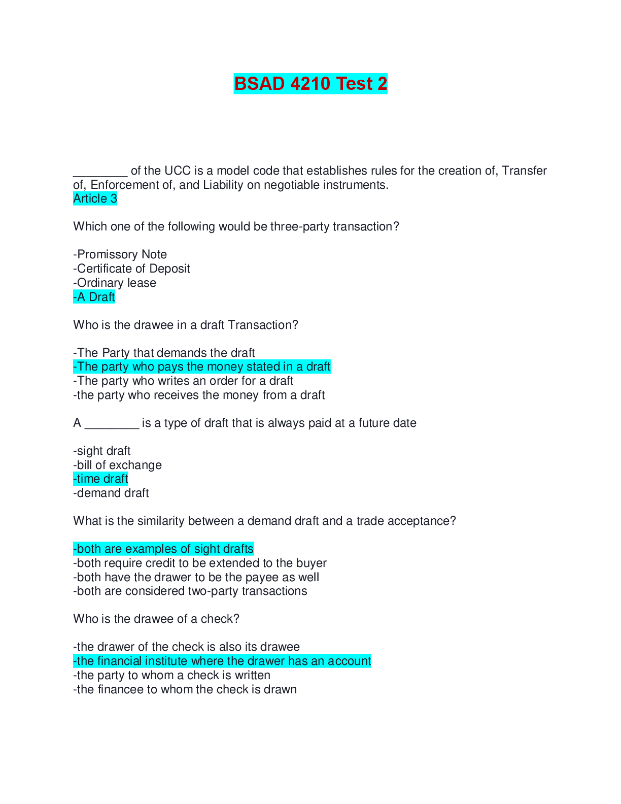 Business Law > EXAM > BSAD 4210 Test 2 | Verified with 100% Correct Answers (All)