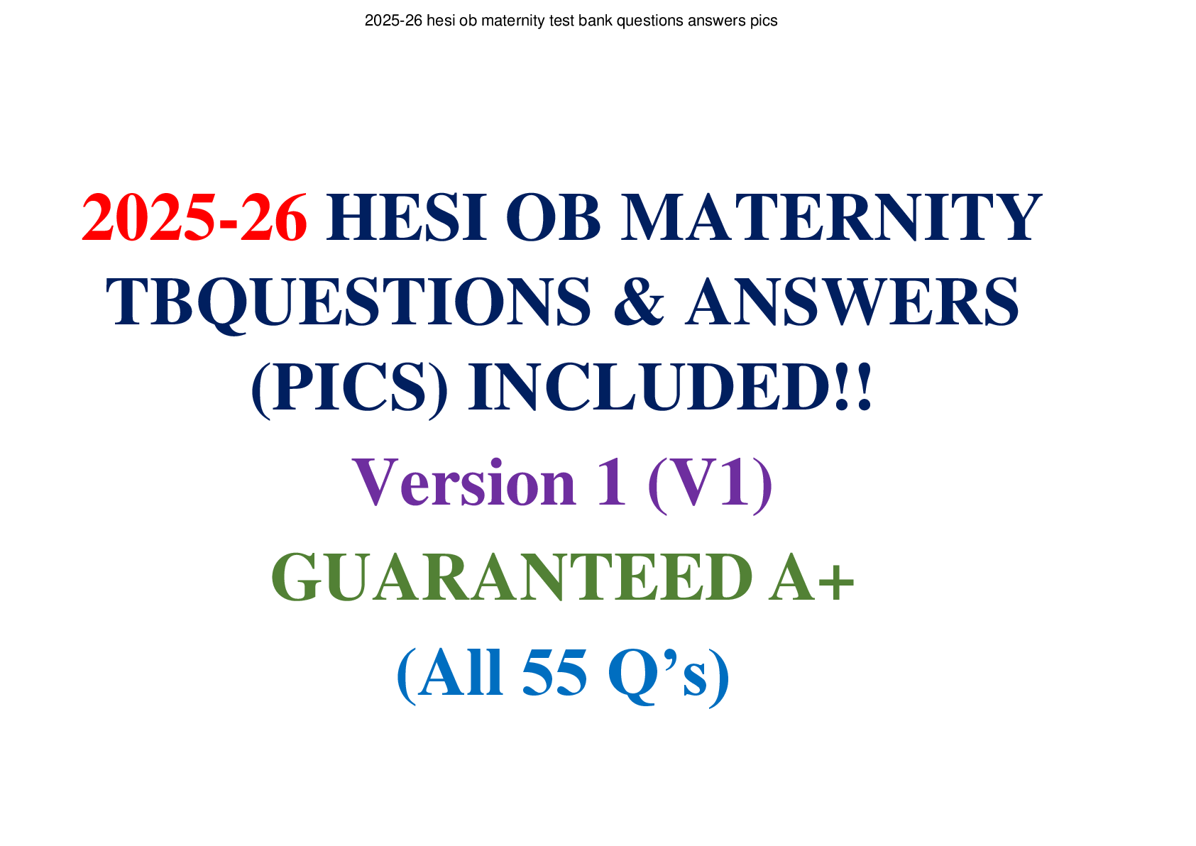 HESI OB MATERNITY TB QUESTIONS & ANSWERS (PICS) INCLUDED!! Version 1 (V1) GUARANTEED A+ (All 55 Q’s) HESI OB PEDS EXAM 2025-26 TEST l BANK (REVISED) 2 VERSIONS EACH WITH 55 QUESTIONS WITH VERIFIEDCOR...