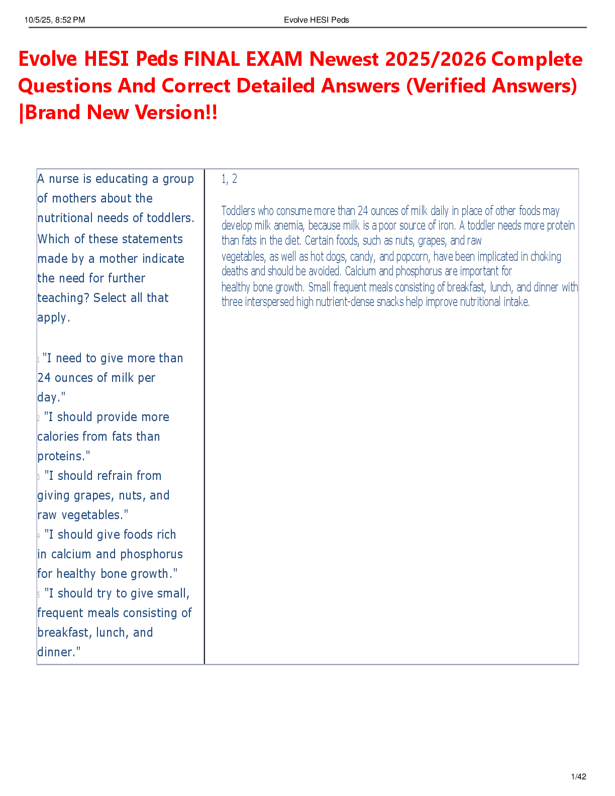 PEDS HESI Newest 2025/2026 Complete Questions And Correct Detailed Answers (Verified Answers) |Brand New Version!PEDS HESI Newest 2025/2026 Complete Questions And Correct Detailed Answers (Verified An...