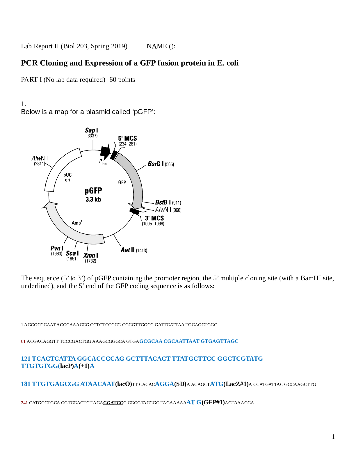 Biology > Lab Report > Genetics Lab Report II (Biol 203, Spring LATEST UPDATE) PCR Cloning and Expression of a GFP fusion p (All)