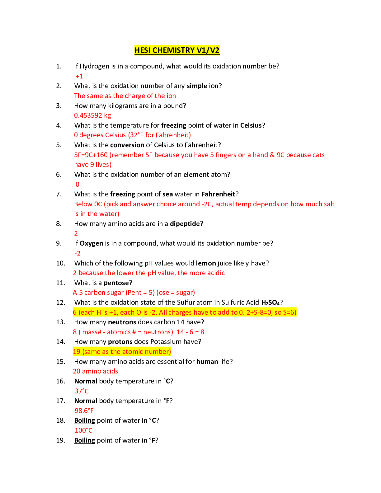 HESI CHEMISTRY V1/V2 1. If Hydrogen is in a compound, what would its oxidation number be? 2. What is the oxidation number of any simple ion? 3. How many kilograms are in a pound? 4. What is the t...