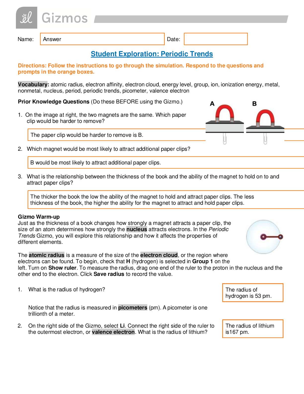 Chemistry> GIZMOS > GIZMOS. CHEMISTRY 101: Student Exploration: Periodic Trends/ Periodic Trends Gizmo. atomic radius, electron affinity, electron cloud, energy level, group, ion, ionization energy, metal, nonmetal, nucleus, period, periodic trends, picometer, valence electr (All)