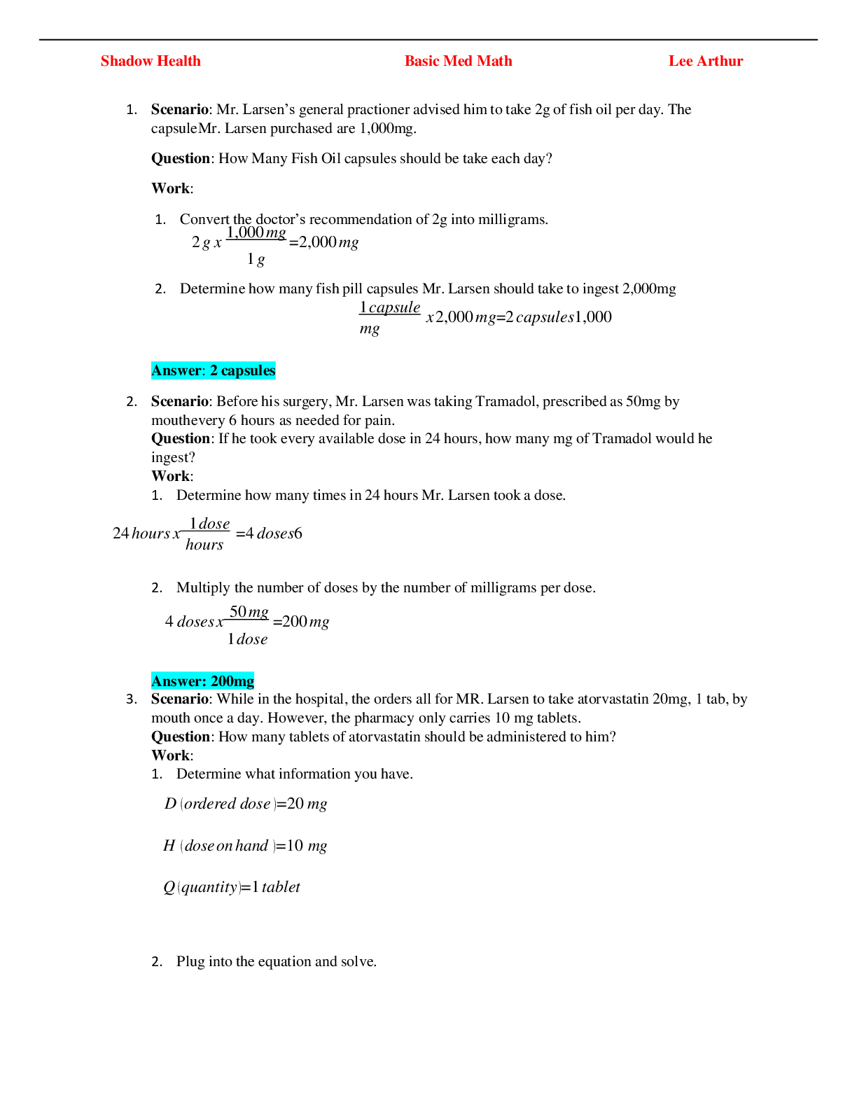 SHADOW HEALTH| BASIC MED MATH| NUR 112 Complete With Correct Answers