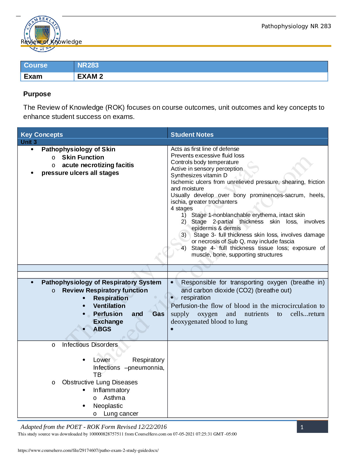 Review of Knowledge Course NR283 Exam EXAM 2 Purpose The Review of Knowledge (ROK) focuses on course outcomes, unit outcomes and key concepts to enhance student success on exams. Key Concepts...