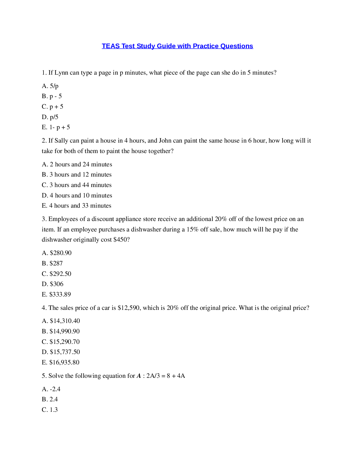 TEAS Test Study Guide with Practice Questions 1. If Lynn can type a page in p minutes, what piece of the page can she do in 5 minutes? A. 5/p B. p - 5 C. p + 5 D. p/5 E. 1- p + 5 2. If Sall...