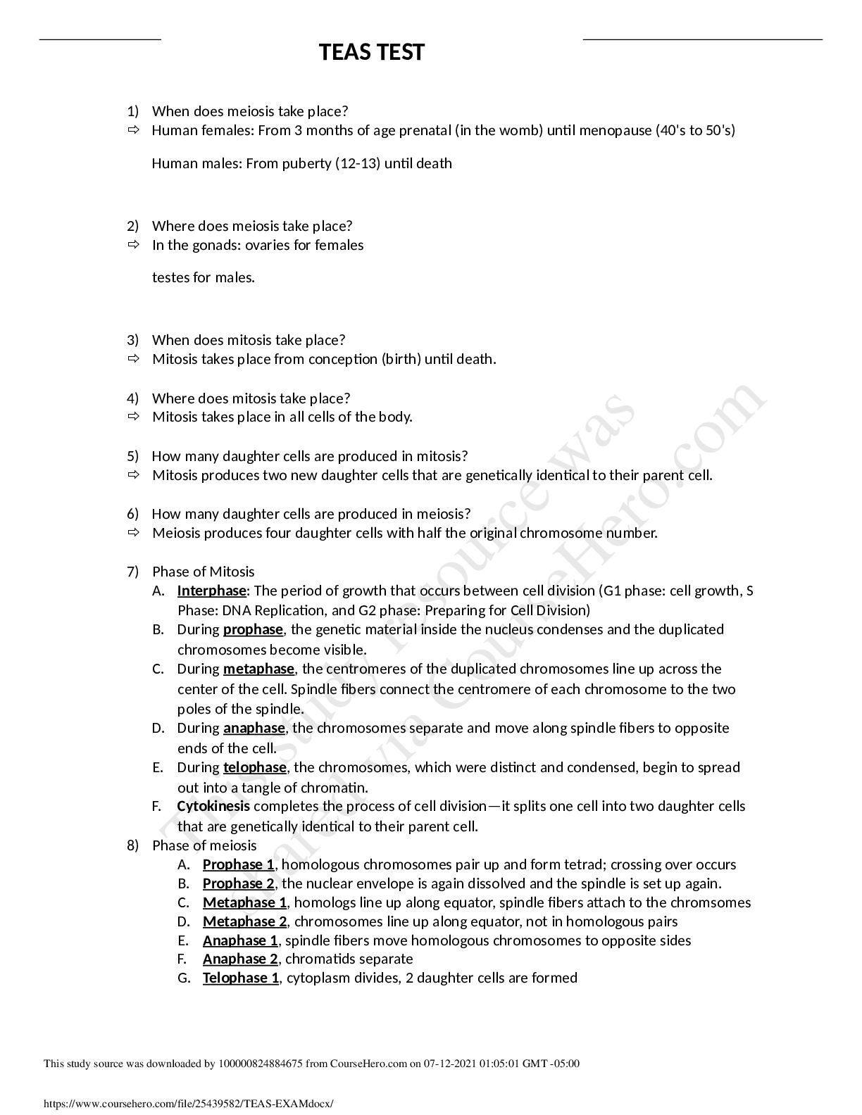 TEAS TEST 1) When does meiosis take place? 2) Where does meiosis take place? 3) When does mitosis take place? 4) Where does mitosis take place? 5) How many daughter cells are produced in mitosis? 6) H...