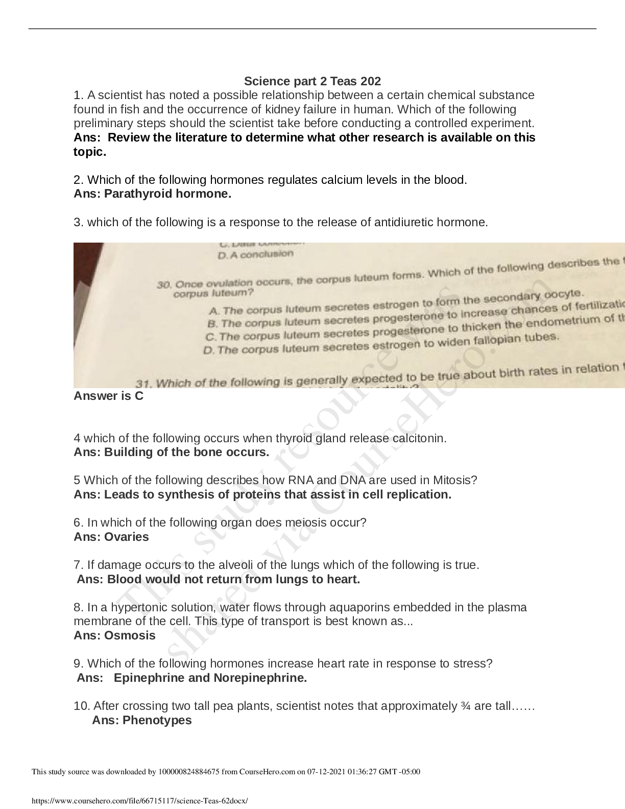 Science part 2 Teas 202 1. A scientist has noted a possible relationship between a certain chemical substance found in fish and the occurrence of kidney failure in human. Which of the following prelim...