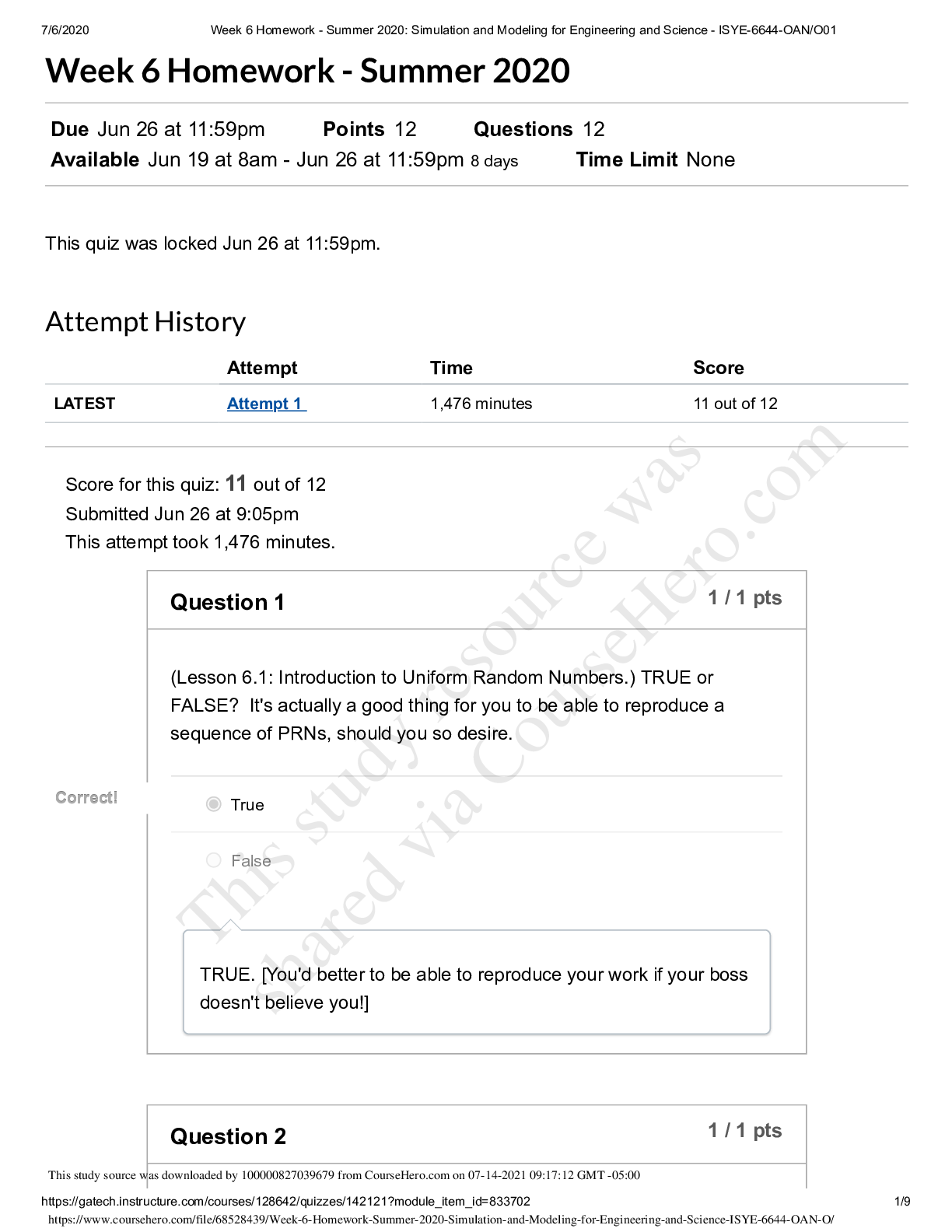 Mathematics> QUESTIONS & ANSWERS > Georgia Institute Of Technology ISYE 6644 Week 6 Homework - Summer 2020_ Simulation and Modeling for Engineering and Science - ISYE-6644-OAN_O-ALL ANSWERS CORRECT (All)