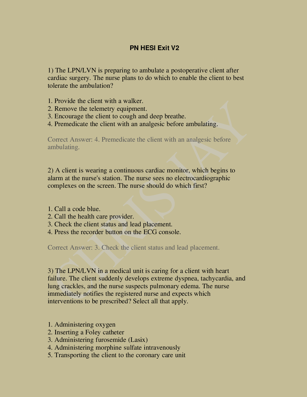 PN HESI Exit V2 1) The LPN/LVN is preparing to ambulate a postoperative client after cardiac surgery. The nurse plans to do which to enable the client to best tolerate the ambulation? 1. Provide t...