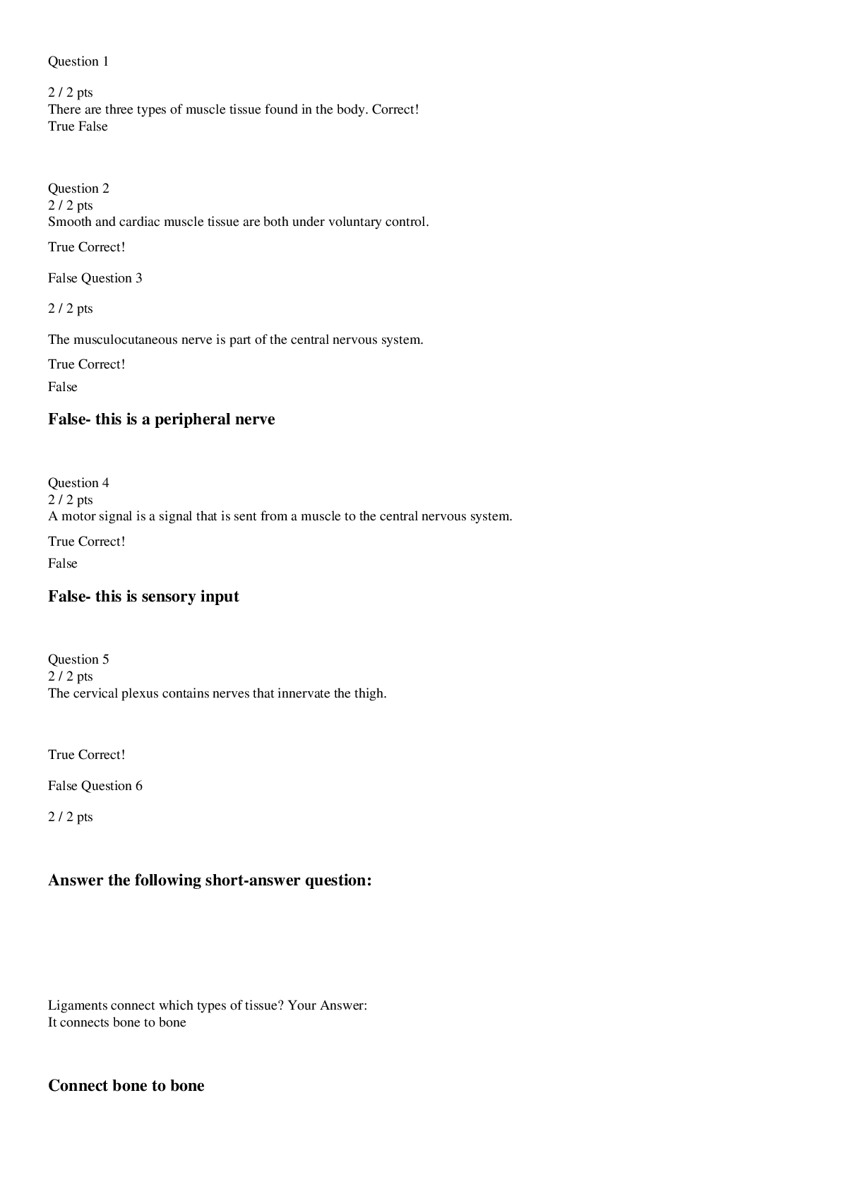 A&P 1 101 Module 5 Exam Muscular (GRADED A+) Questions and Answers Question 1 2 / 2 pts There are three types of muscle tissue found in the body. Correct! True False Question 2 2 / 2 pts S...
