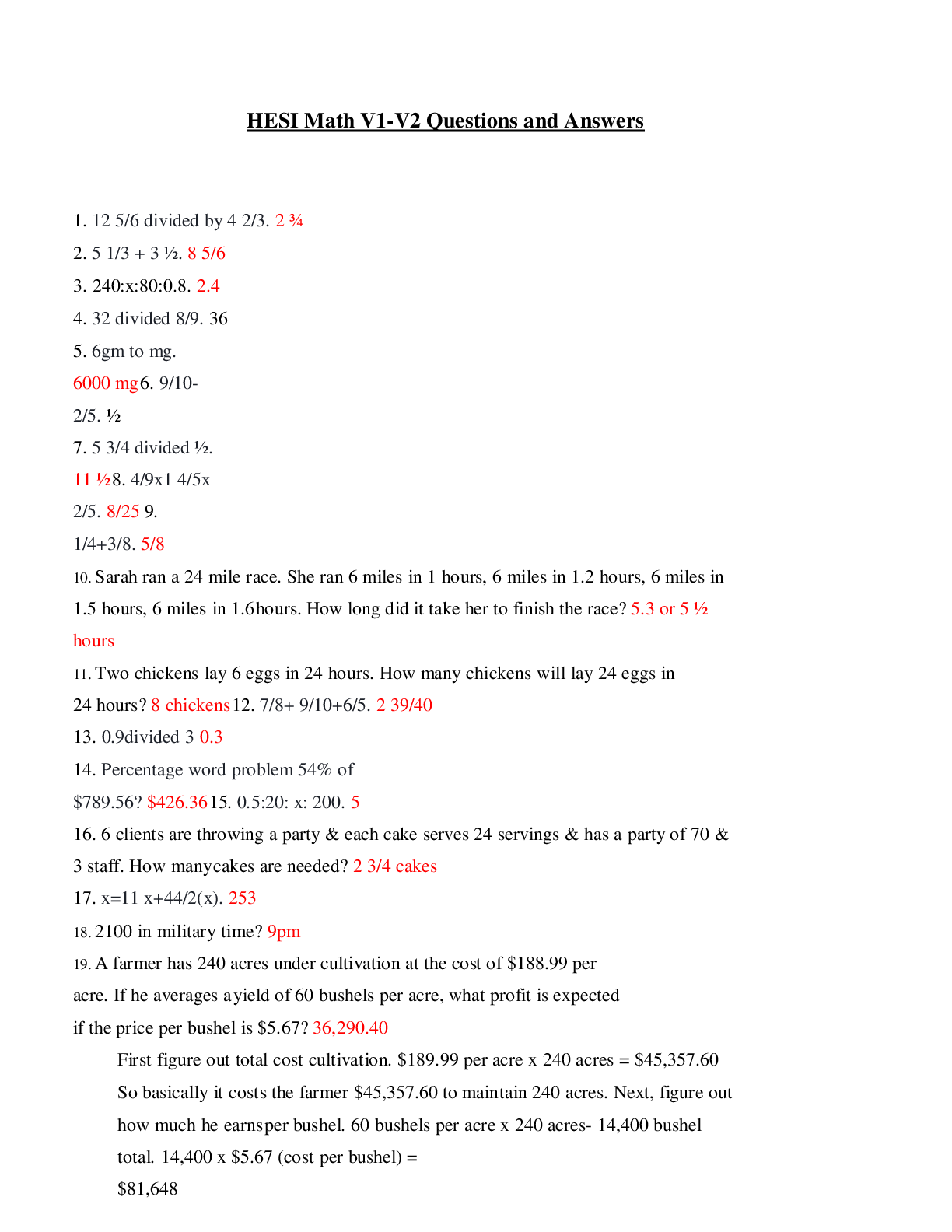 HESI Math V1-V2 Questions and Answers