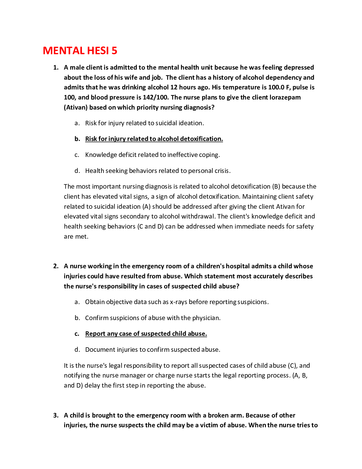 Mental Health HESI 6 Psychiatric Hesi book 1. A nurse working in the emergency department of a children's hospital admits a child whose injuries could have been the result of abuse. Which statement...
