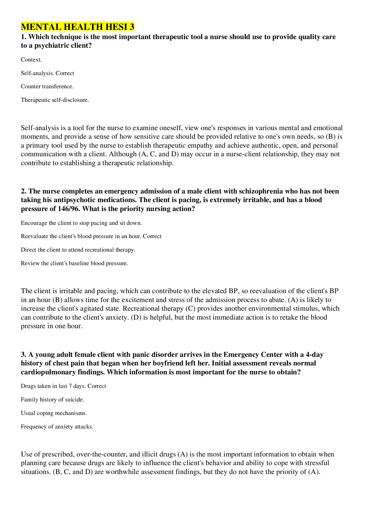 *NURSING> HESI > MENTAL HEALTH HESI 3 (All)