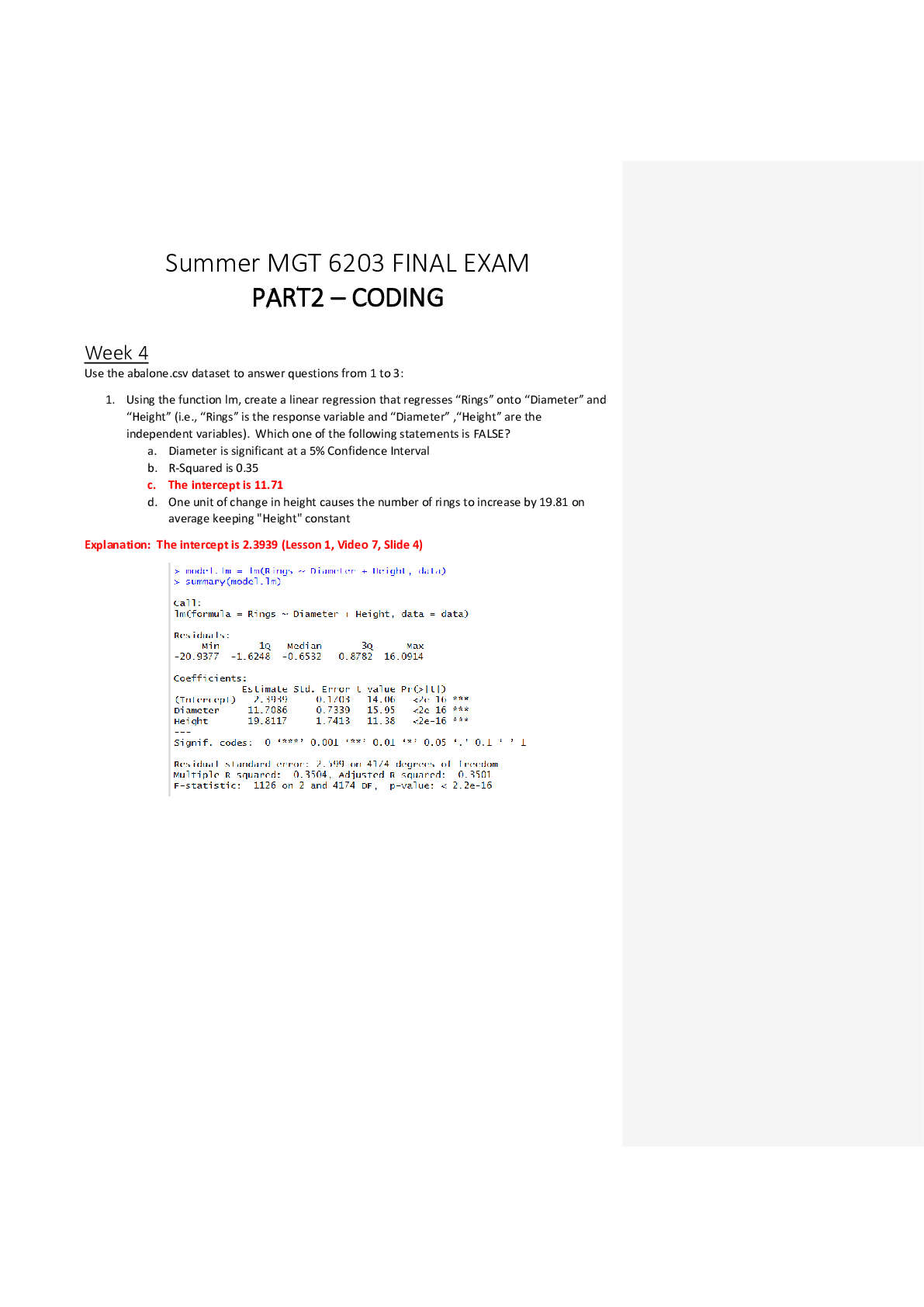 Summer MGT 6203 FINAL EXAM PART2 – CODING Week 4 Use the abalone.csv dataset to answer questions from 1 to 3: 1. Using the function lm, create a linear regression that regresses “Rings” onto “Diam...