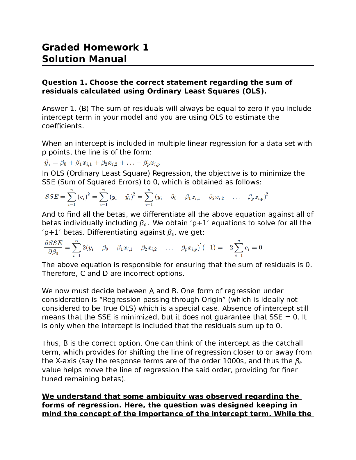Graded Homework 1 Solution Manual Question 1. Choose the correct statement regarding the sum of residuals calculated using Ordinary Least Squares (OLS). Answer 1. (B) The sum of residuals will alw...