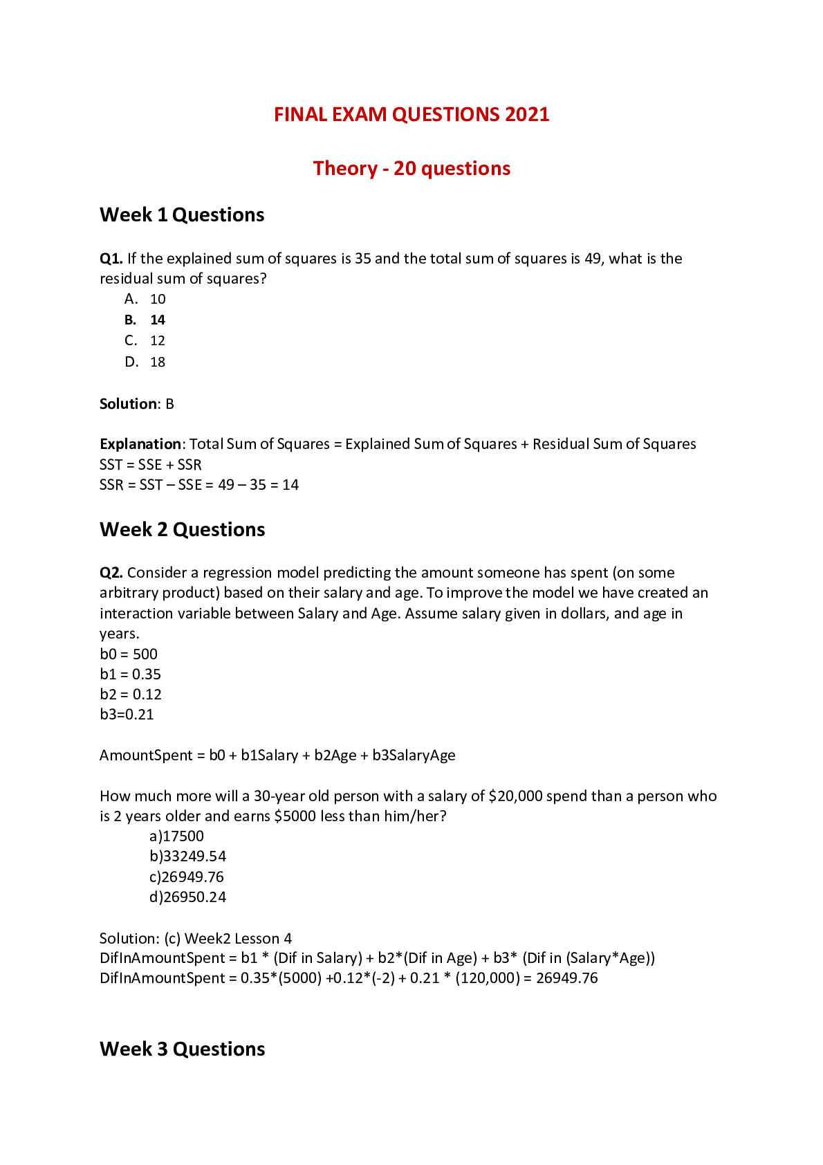 FINAL EXAM QUESTIONS 2021 Theory - 20 questions Week 1 Questions Q1. If the explained sum of squares is 35 and the total sum of squares is 49, what is the residual sum of squares? A. 10 B....