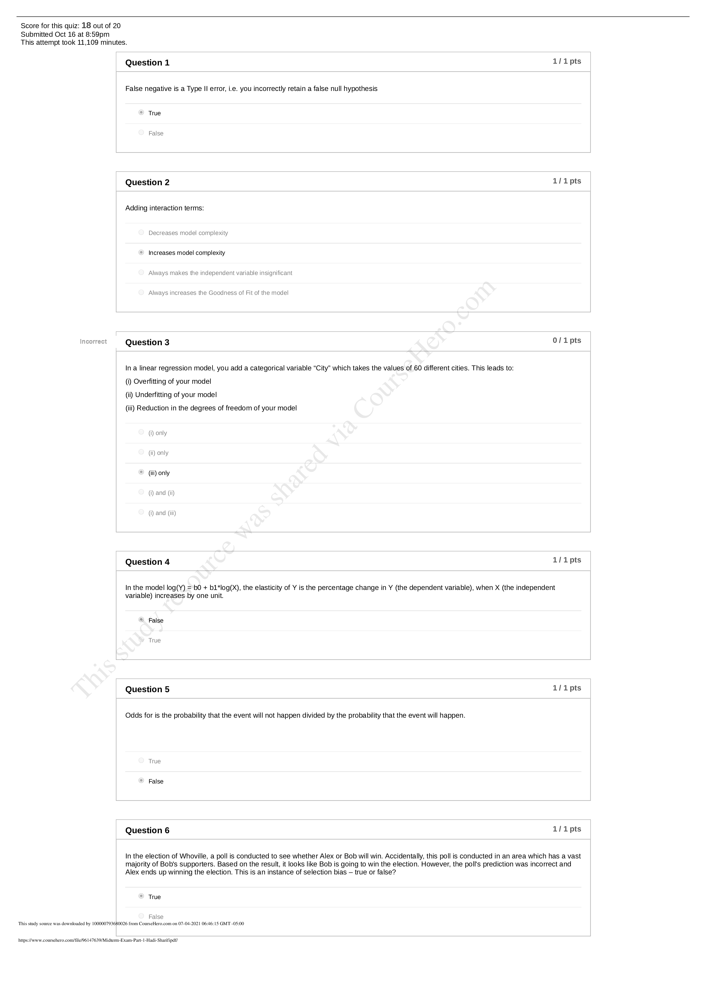 Question 1 1 / 1 pts False negative is a Type II error, i.e. you incorrectly retain a false null hypothesis True False Question 2 1 / 1 pts Adding interaction terms: Decreases model complexity...