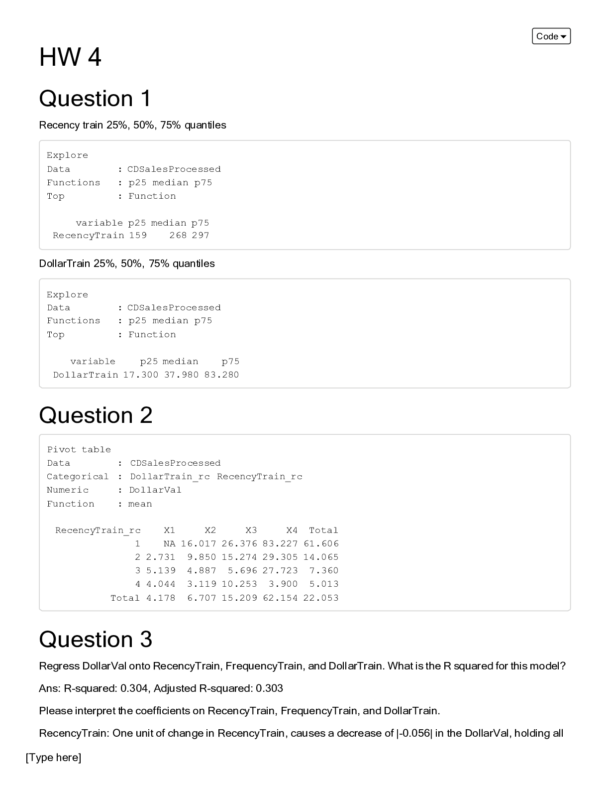 Question 1 Recency train 25%, 50%, 75% quantiles DollarTrain 25%, 50%, 75% quantiles Question 2 RecencyTrain_rc X1 X2 X3 X4 Total 1 NA 16.017 26.376 83.227 61.606 2 2.731 9...