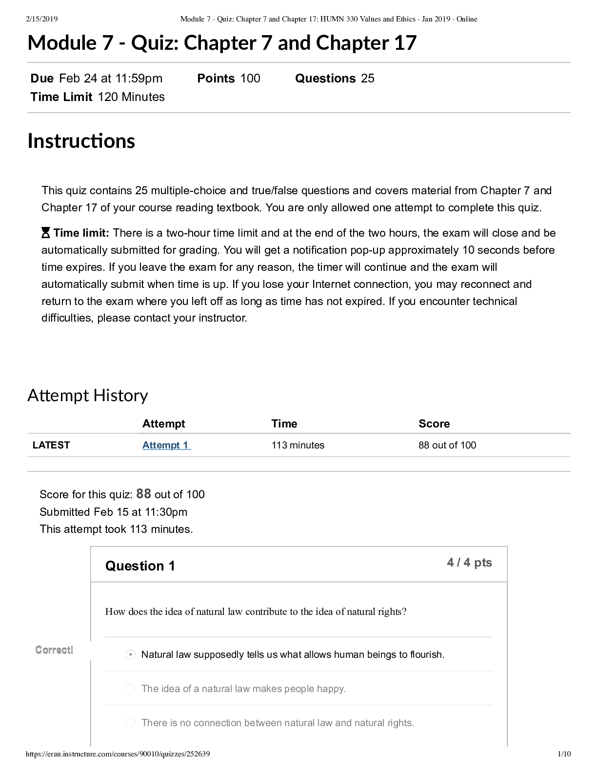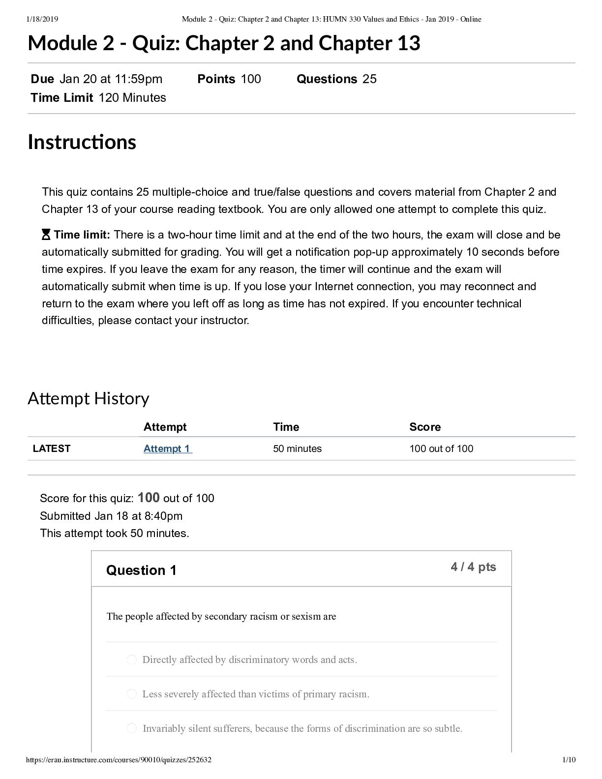 General Questions> EXAM > Module 1 Quiz: Chapter 1 and 10: HUMN 330 Values and Ethics/ (Score for this quiz: 100 out of 100). (All)